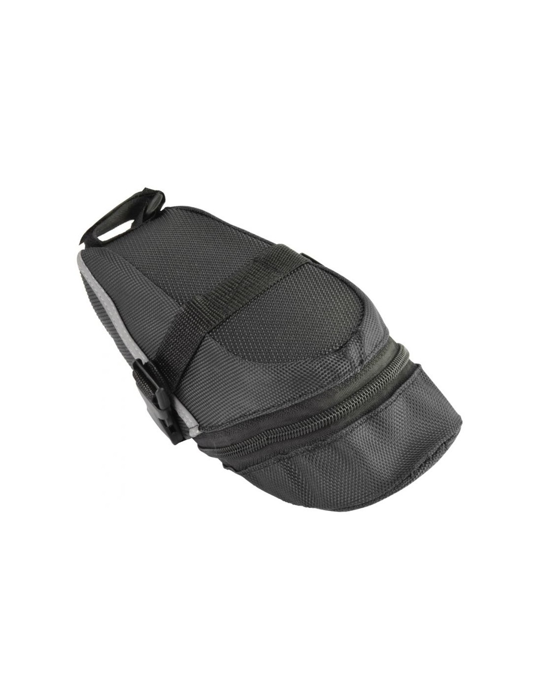 Waterproof small bicycle bag for attachment under the bicycle saddle. Mounted through Velcro and buckle. Equipped with reflective elements.