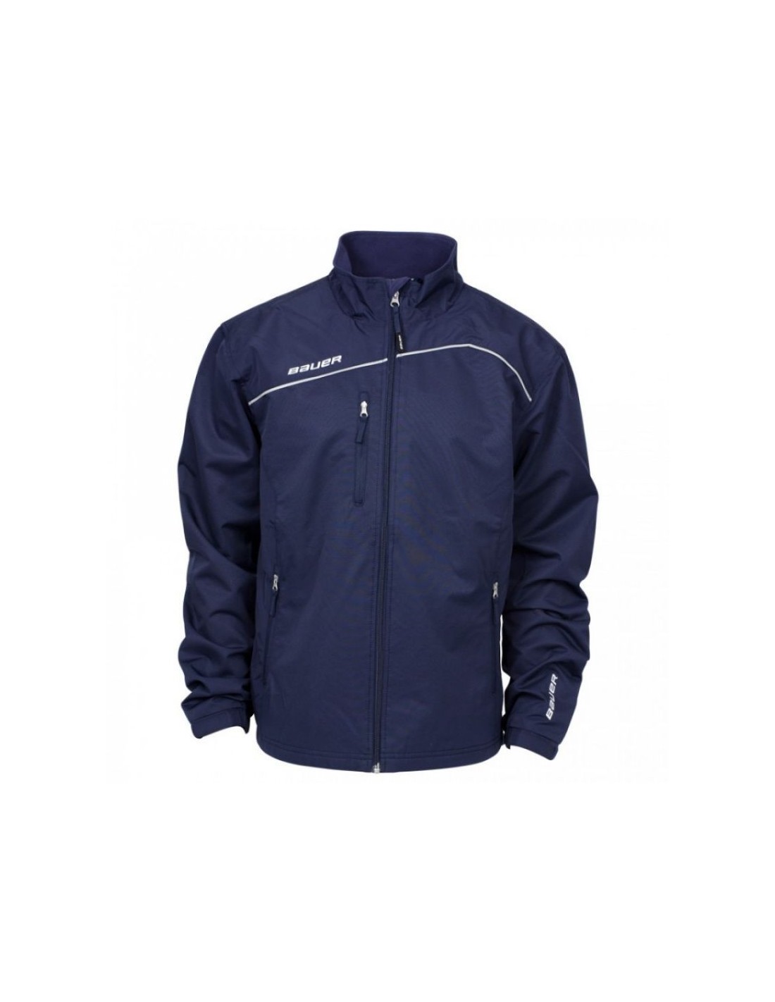 Bauer jacket with a zipper and side zipper pockets. Exterior pocket on the right chest for a media player with an internal channel for headphones, fastened with a zipper. Highly water-resistant jacket, made of waterproof dobby polyester. Embroidered BAUER logo on the chest and under the collar, on the back and on the left sleeve. Additional internal mesh pocket, fastened with Velcro. Internal mesh lining is coated with a moisture-wicking 3MT Scotchgard™ Protector layer. Fleece on the collar from the inside. Velcro fastened cuffs on the sleeves. Durable, lightweight and breathable jacket, ideal for personalization. Rear vent allows for better airflow and cooling. High-quality YKK zippers. Material: 100% Polyester. Size: Youth, Children\’s.