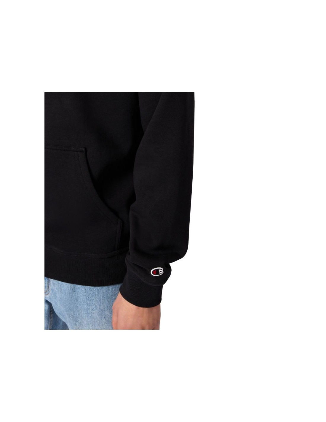 Champion Men\’s Hooded Sweatshirt, Black 220271 KK001. This Champion men\’s sweatshirt is perfect for everyday wear. Standard fit. Fixed, adjustable hood. Ribbed cuffs and hem. Front pocket. Logo on chest and sleeve. Material: 70% cotton, 30% polyester.