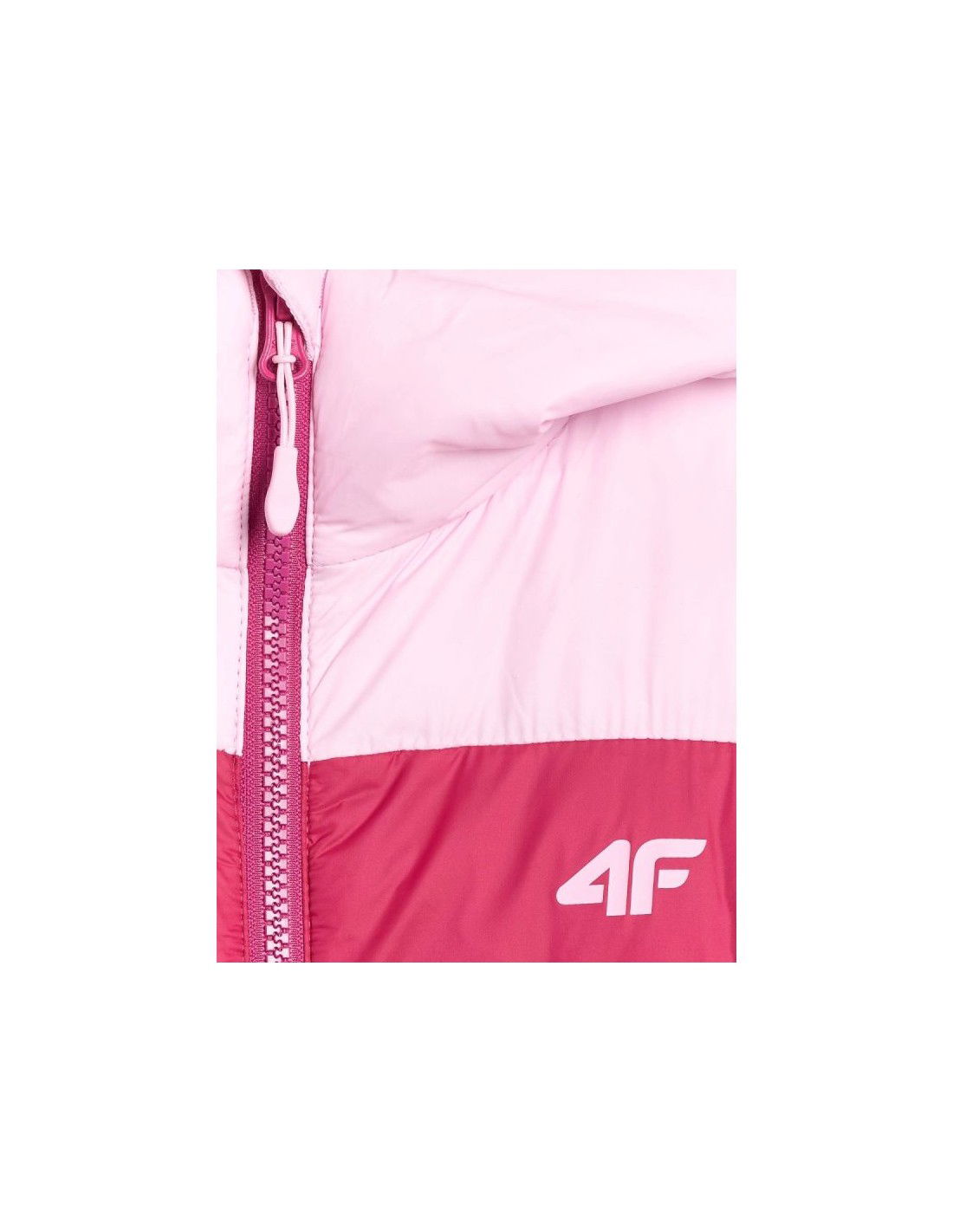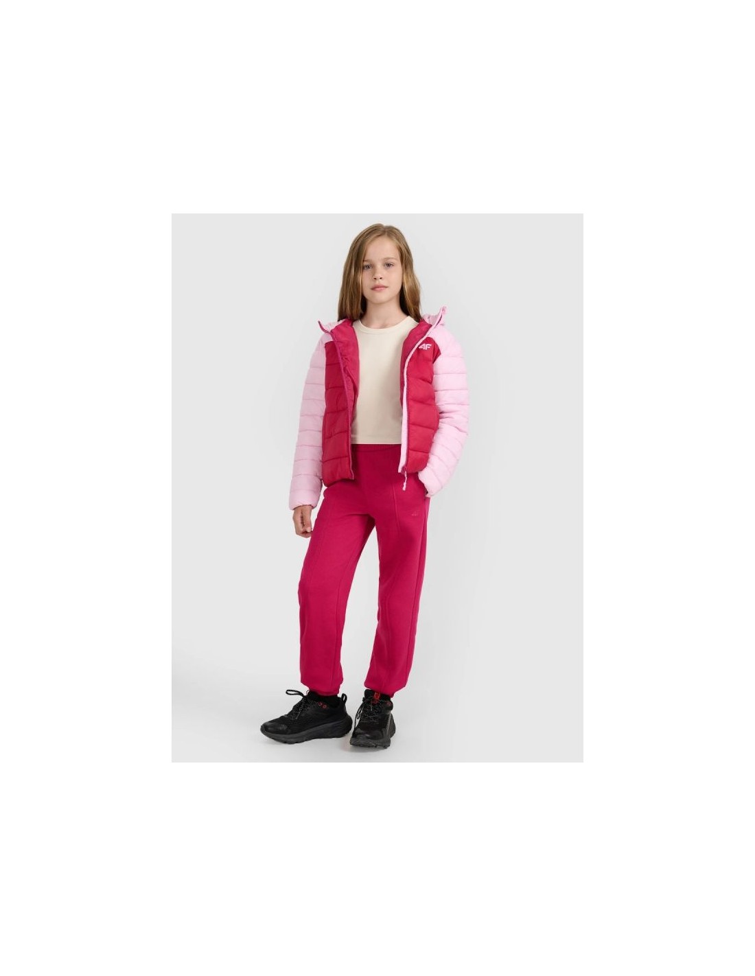 Girls\’ down jacket with synthetic filling – warmth and style in pink This girls\’ down jacket from 4F is perfect for girls who need effective protection from the cold while also wanting a lightweight and fashionable outer layer. The pink color scheme and quilted design combine functionality with style. :contentReference[oaicite:1]{index=1} CHARACTERISTICS: Fit – regular, designed with girls in mind, offers a comfortable fit and freedom of movement. Intended use – for everyday use, for school, walks, outdoor activities in the transitional season or colder days. Technology – Synthetic fill provides warmth even in wetter conditions, while remaining lightweight and easy to care for. :contentReference[oaicite:2]{index=2} Hydrophobic coating – limits moisture absorption, keeping the jacket dry and comfortable for longer. :contentReference[oaicite:3]{index=3} Functional details – high collar, hood, full zipper, side pockets and elastic cuffs and hem for better protection against the cold. Composition – outer material: polyester; filling: synthetic (detailed values not provided in the public description) :contentReference[oaicite:4]{index=4} Weight – medium-weight model, suitable as a main layer or a stand-alone jacket on colder days. The jacket is perfect as a top layer for autumn and winter days—just pair it with a base layer, such as a thermal or fleece. It pairs perfectly with leggings or outdoor pants, creating a functional and fashionable ensemble. Check also: girls\’ jackets and vests , pants for girls