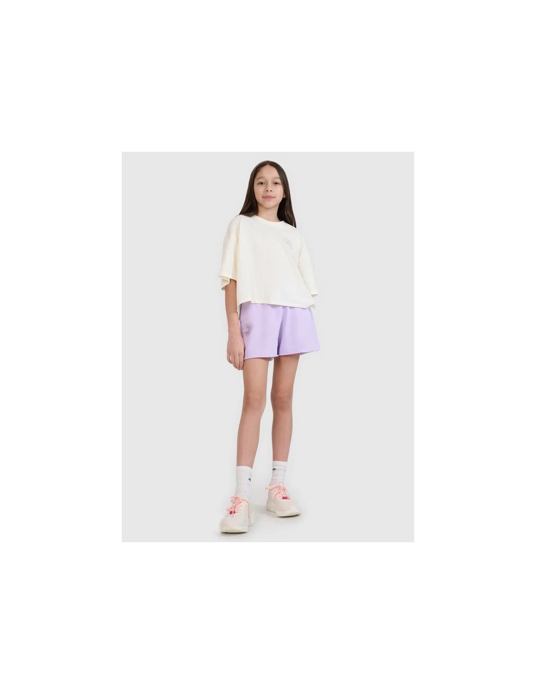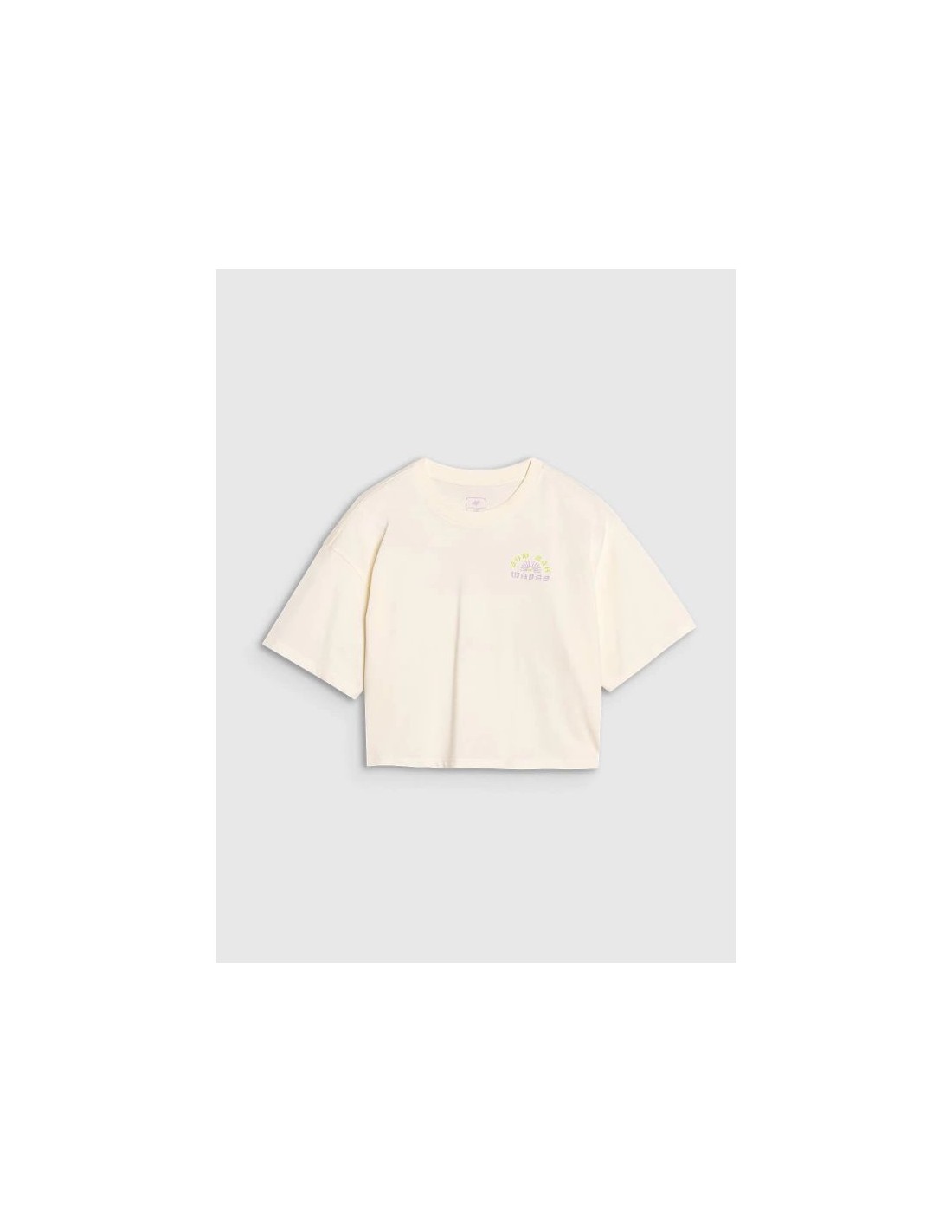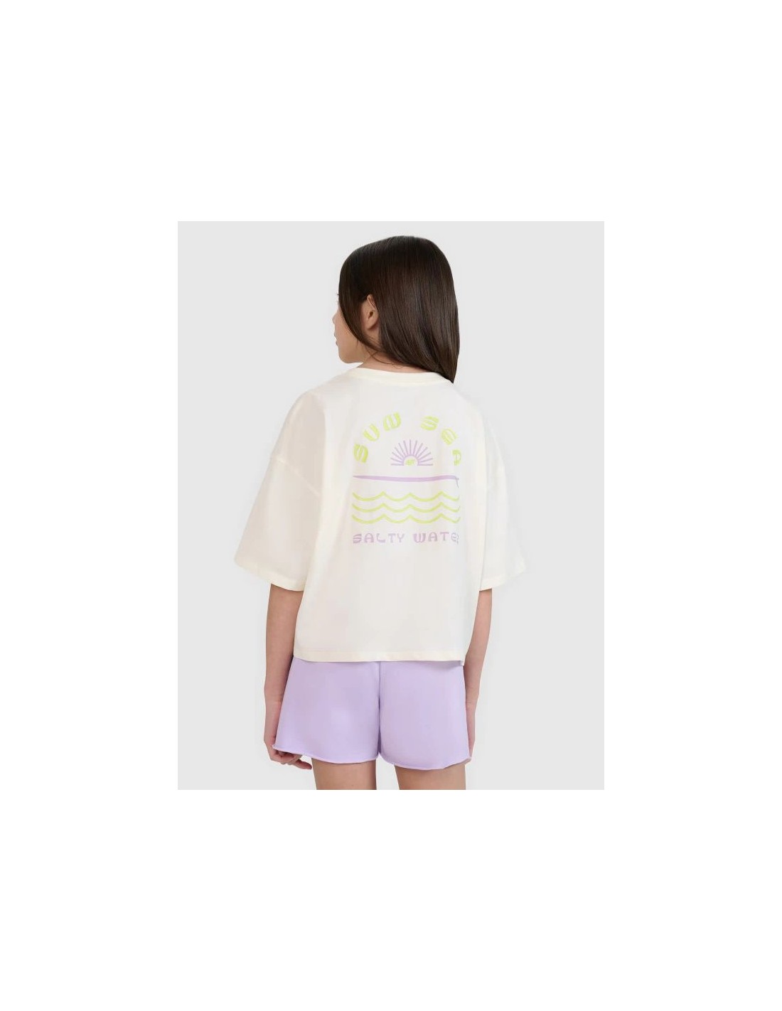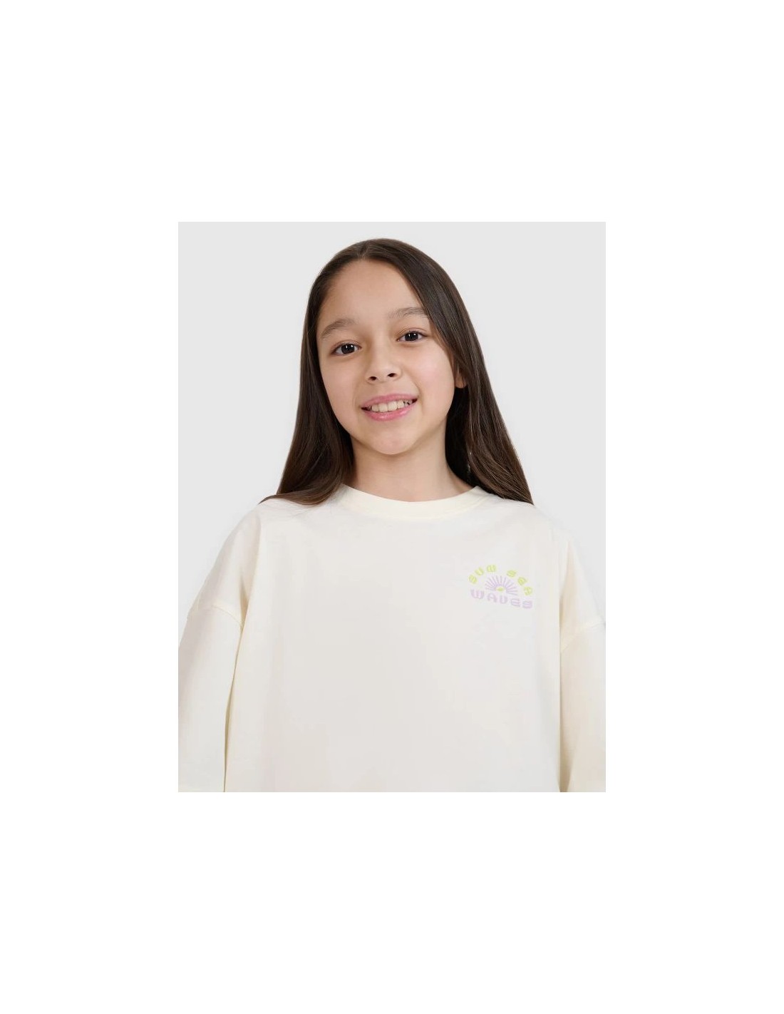 Oversized girls\’ T-shirt with print – light and stylish This girls\’ T-shirt is a great everyday choice—for both casual and sporty outfits. The loose, oversized fit and cropped silhouette guarantee comfort and a modern look. This T-shirt is made of lightweight, 160 gsm single jersey fabric. This makes it breathable, flexible, and comfortable to wear—perfect for summer days or as an undershirt under a sweatshirt or shirt. Made of 100% cotton , it\’s soft, durable, and pleasant to the touch. Finished with a round neckline with light ribbed detailing and dropped shoulders, the \”Sun Sea Waves\” print on the front and back gives this T-shirt a casual, summery feel. Key features: Weight: 160 gsm – light and airy material Size range: 122–164 Oversize cut – loose fit Shortened cropped style – reaches to the waist 100% cotton – softness, durability and comfort Acid-wash effect – a fashionable, washed-out look Single jersey knit fabric – smooth surface Round neckline with light ribbed detail \”Sun Sea Waves\” inscription on the front and back Dropped shoulder line – modern design