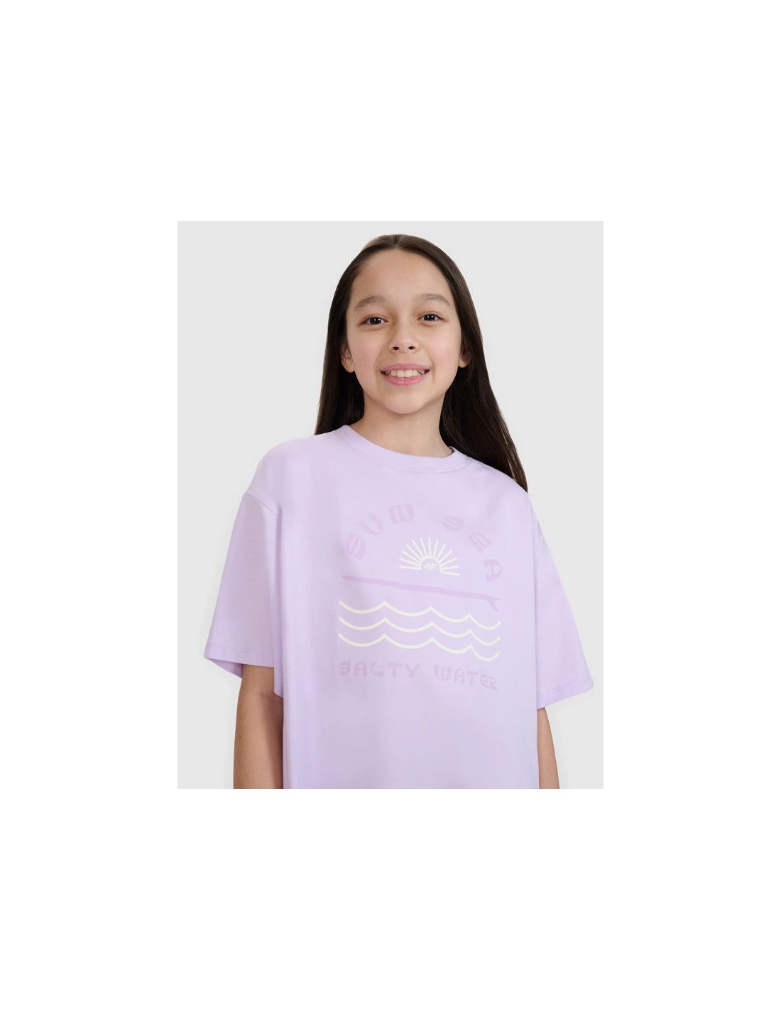 Girls\’ oversize T-shirt 4F This girls\’ T-shirt is a comfortable and stylish choice for everyday wear. Made of soft 100% cotton, it provides comfort and freedom of movement. The loose, oversized fit and surf print on the front give it a modern feel. This T-shirt is perfect for both casual and sporty outfits . The lightweight and airy single jersey fabric guarantees comfort on summer days and also works well as an undershirt under a sweatshirt or shirt. Key features: Weight: 160 gsm – light, airy material Size range: 122–164 Cut: oversize – loose cut ensuring freedom of movement Composition: 100% cotton – soft and durable to the touch Knitwear: single jersey – smooth and comfortable Round neckline with light ribbed detail Dropped shoulder line – casual and modern style Solid colors with a surfer-themed print Why is it worth it? Soft and airy fabric, perfect for summer Loose fit for comfortable wear A stylish print that adds character to your outfit