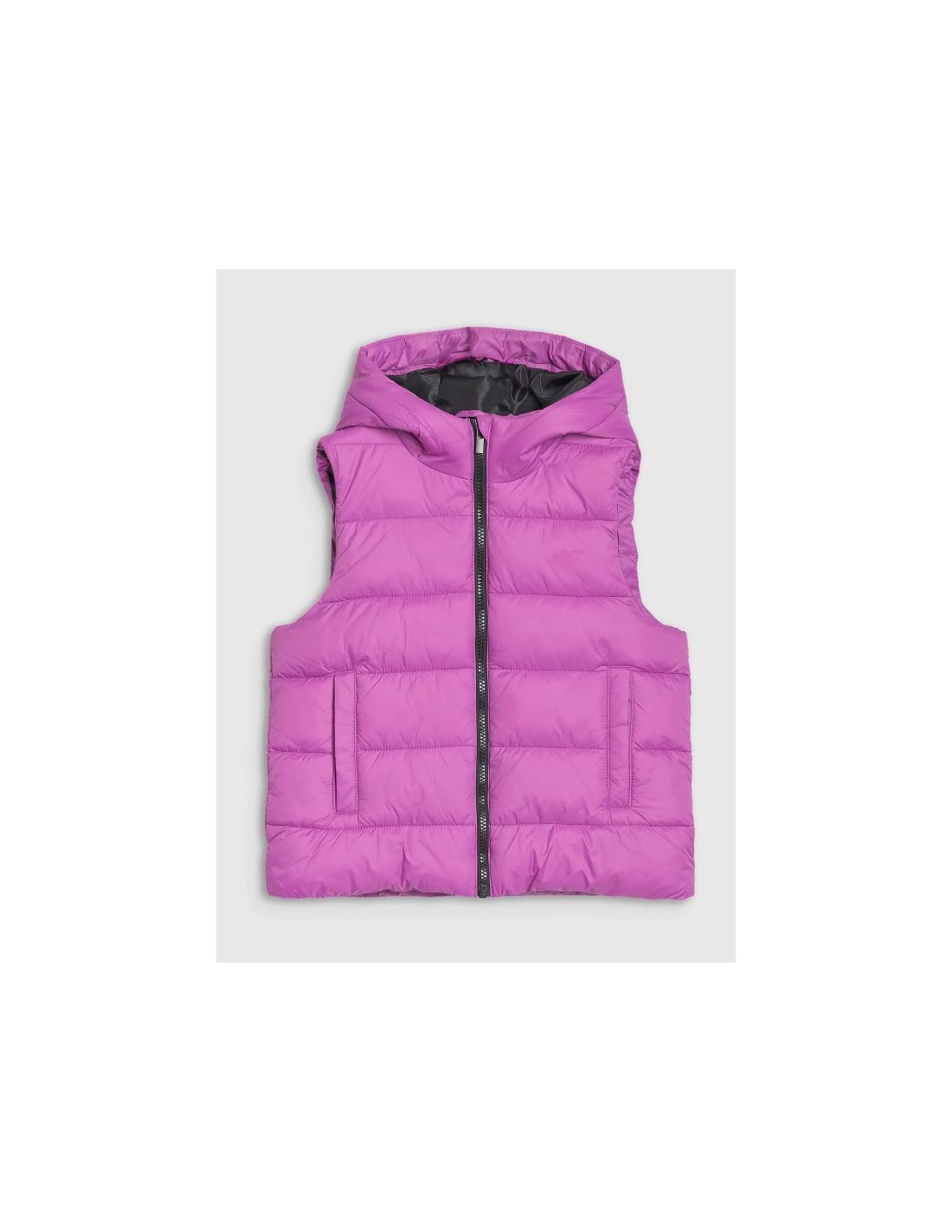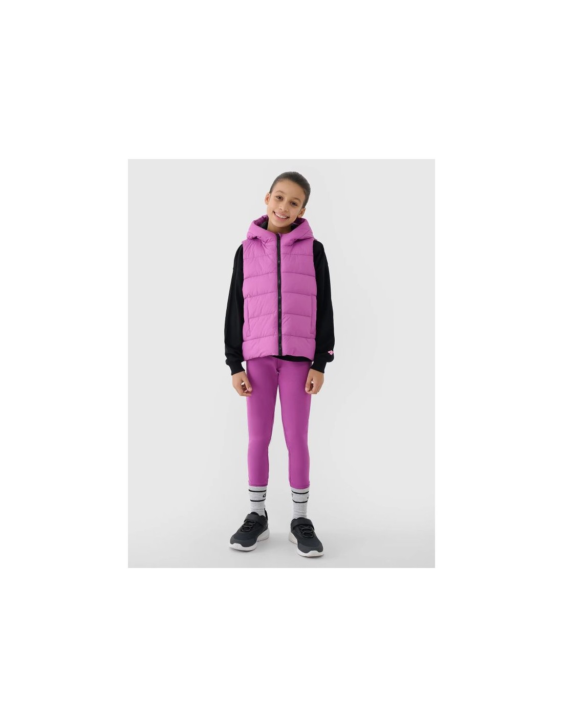 The 4F girls\’ down vest is a perfect choice for colder days, combining thermal comfort with functionality . Thanks to its moderate fill power , the vest provides adequate insulation against the cold without weighing you down, allowing for complete freedom of movement during everyday and sporting activities. Product Features: Regular fit : Comfortably fits the body, ensuring comfort and freedom of wear. Quilting : Classic horizontal quilting effectively provides thermal insulation and compressibility , ensuring thermal comfort on colder days. Synthetic Down : Filled with synthetic down , which is more durable and easier to care for than natural down. Synthetic down dries faster and retains its insulating properties, even in damp conditions. Hydrophobic Coating : The outer layer of the material has a hydrophobic coating that protects against the absorption of moisture, allowing it to flow freely over the surface. 4FWarm technology : Ensures thermal comfort by providing optimal insulation without excessive load. Functional Hood : Integrated hood without adjustment and a low stand-up collar protect against wind and cold. Practical Pockets : 2 open side pockets provide space for small items. High Quality Rip Stop Fabric : Rip stop fabric protects against tears and damage during heavy use. Windproof Pleat : The windproof pleat inside the main zipper protects against the cold. The perfect choice for colder days when thermal insulation , thermal comfort and freedom of movement are important.