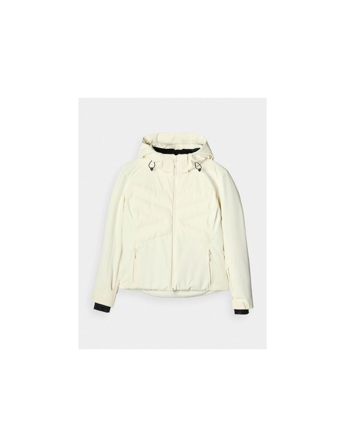 Women\’s 4F ski jacket with hood – Dermizax 20000, PrimaLoft The 4F women\’s ski jacket is a technologically advanced model designed for intense winter activities on the slopes. The regular cut and standard hip length ensure a comfortable fit and complete freedom of movement. The combination of a Dermizax 20,000 membrane , PrimaLoft insulation , and flexible 4Way Stretch material guarantees effective protection against wind, snow, and moisture, maintaining thermal comfort for long hours of skiing. This premium jacket is designed for women who expect maximum functionality and reliability in challenging weather conditions. PRODUCT FEATURES: Cut: regular, comfortably fitting to the figure Size range: XS–XXL Material: elastic 4Way Stretch Seams: fully taped, waterproof Coating: hydrophobic impregnation + Teflon Shield Insulation: PrimaLoft ThermoPlume (front/back panels) + PrimaLoft Silver Hood: detachable, with volume and depth adjustment Collar: high, lined with soft plush Cuffs: adjustable with Velcro + inner cuffs with thumb hole Ventilation: underarm, adjustable with a zipper Pockets: 2 side pockets with laminated zippers Internal pockets: goggle pocket + zipped pocket Main zipper: two-way, waterproof, with a wind flap Snow skirt: detachable, adjustable with snaps Battery Guard Pocket: With PrimaLoft insulation to protect your phone battery Extras: silicone elements on the shoulders for easier transport of skis Security: internal patch with SOS instructions PRODUCT PARAMETERS: Membrane: Dermizax 20000 Water resistance: 20,000 mm H2O Breathability: 10,000 g/m²/24h Filling: PrimaLoft ThermoPlume + PrimaLoft Silver (100% polyester)