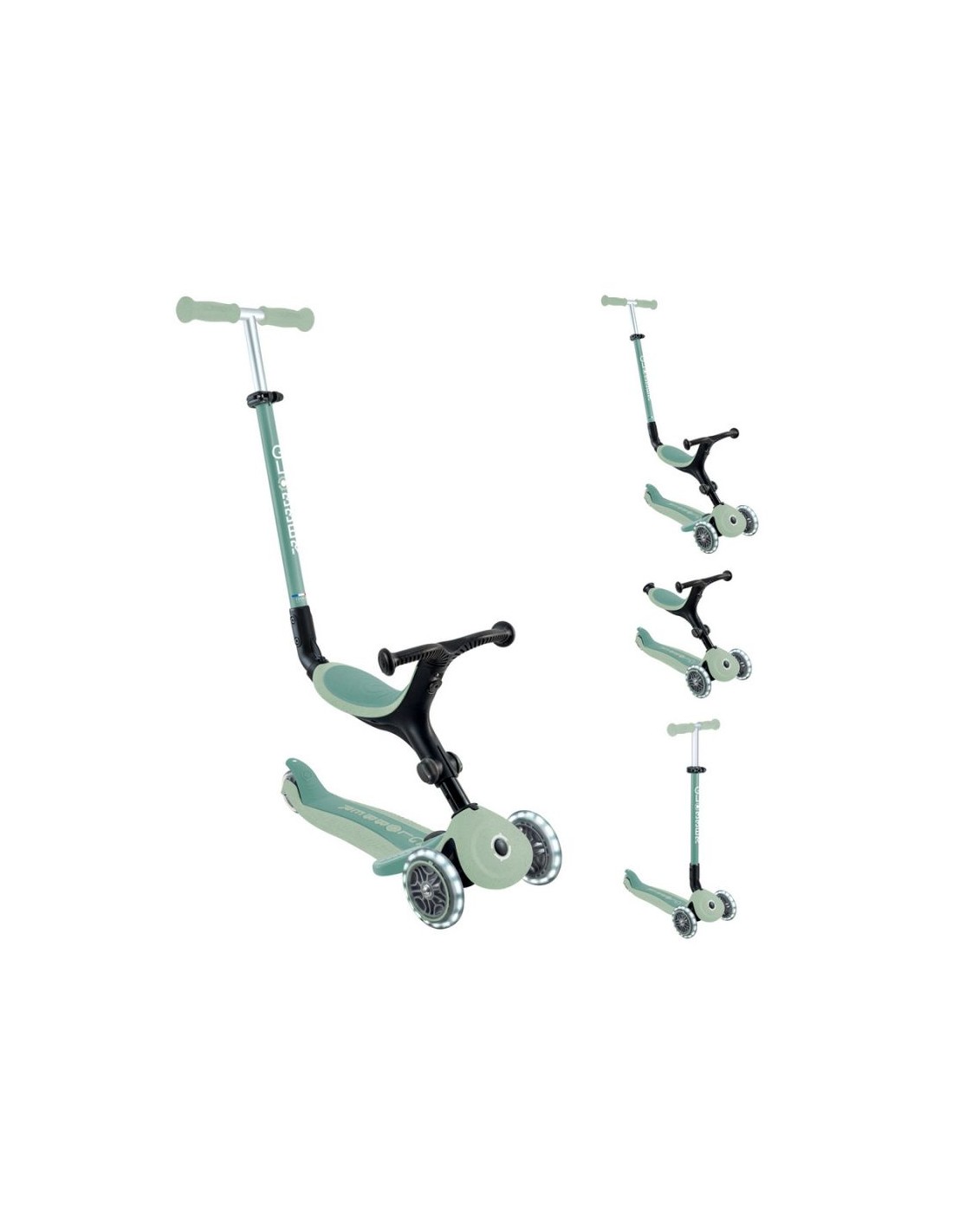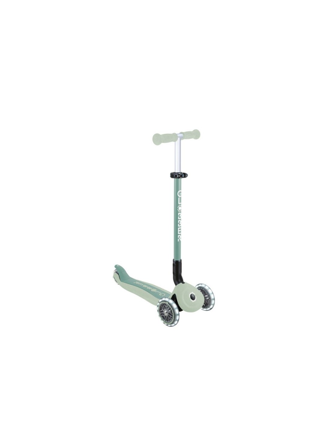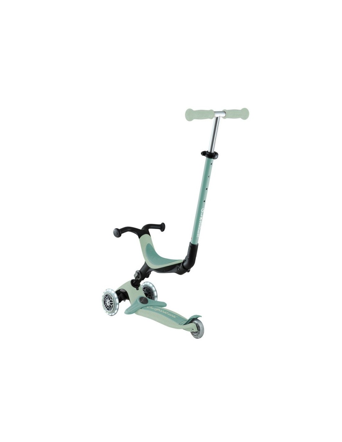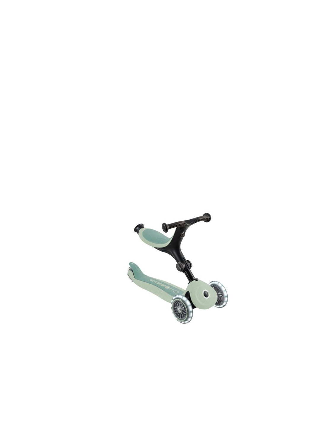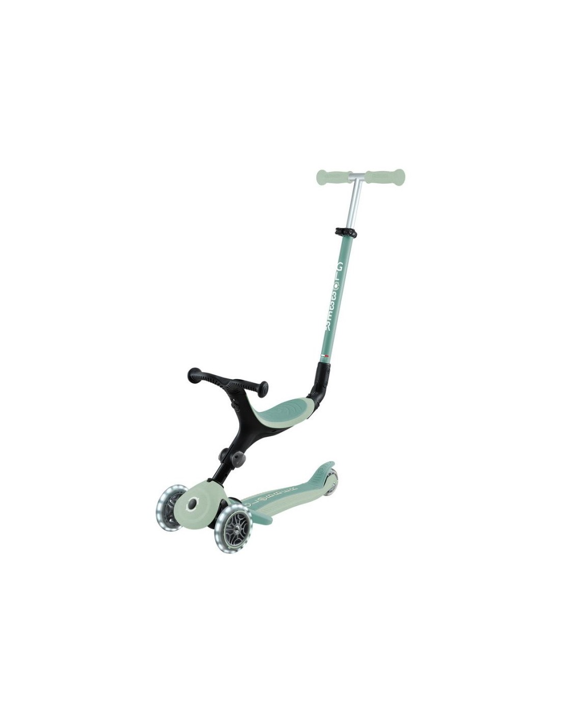 GO • UP Active Lights ECOLOGIC An eco-friendly all-in-one scooter with a seat for small children, made from 100% recycled plastic and organic wheat straw*, and equipped with light-up wheels. The vehicle offers 3 modes: ride-on car with handle for parents (15 months – 3 years) tricycle – balance bike (15 months – 3 years) scooter with 4-level height adjustment and foldable structure (3-9+ years) Simple, tool-free and intuitive transformation between modes using a solidly designed combination of buttons and knobs. The patented folding system allows for convenient transport and storage of the vehicle. The patented steering lock system allows for straight-line driving only. This option is useful for beginners; once your child has mastered balance, you can restore full control with a single button. The vehicle is equipped with light-up wheels that flash white while driving and do not require the use of any batteries. Made from 100% recycled plastic to the global GRS standard and biodegradable wheat straw* Eco-friendly packaging made from recycled paper and is plastic-free. GO • UP Active Lights ECOLOGIC is available in four pastel colors inspired by nature: pistachio, peach, blueberry and bilberry. GO • UP Active Lights ECOLOGIC is made of 100% GRS plastic and biodegradable wheat straw*. GRS is an international protocol that verifies the recycled content of end products. Using GRS plastic saves tons of waste from landfills and mitigates the environmental impact of production. Wheat straw is a 100% renewable, biodegradable bioplastic derived from agricultural waste. Using wheat straw diverts waste and helps decompose other plastics. The plastic maintains its structural integrity and is 100% child-safe. Choose Globber. Choose greener! 100% tool-free design 100% tool-free design allows you to easily switch between different modes without the need for tools or screws – GO • UP Active Lights ECOLOGIC has spring-loaded buttons and knobs that allow for a smooth transition from ride-on to scooter mode. Adjustable seat and handlebar for maximum comfort The eco-friendly GO • UP Active Lights ECOLOGIC scooter with a seat has adjustment functions for maximum comfort: TPR saddle with 2-stage height adjustment, adjustable using a side knob without tools 4-step steering wheel adjustment, so the vehicle \”grows\” with the child. Powerful brake The extra long and wide composite rear brake ensures effective braking. Additional footrest The removable footrest provides additional comfort and safety when riding in ride-on mode. It allows the feet to rest securely while the parent controls the vehicle. Solid platform and durable wheels with LED diodes GO • UP Active Lights ECOLOGIC is equipped with a low, metal-reinforced structure that can withstand up to 50 kg and a wide, non-slip composite deck for a safe scooter ride. High-quality, high-rebound, 121mm diameter PU-molded front wheels mounted on ABEC 5 bearings and an 80mm diameter PU-molded rear wheel provide a smooth ride. The front wheels are equipped with LED lights that flash white while riding. Batteries are not required for the wheels. Patented steering lock system The GO • UP Active Lights ECOLOGIC features Globber\’s patented steering lock system, which locks the front wheels of the scooter to only move forward and backward, so kids gain confidence while riding their scooter while developing their balance skills. To enter full steering mode and enable balance steering, simply release the handlebar lock button located at the front of the scooter. Patented folding system Effortlessly carry and store your GO • UP Active Lights ECOLOGIC in a compact form! Featuring a patented folding system, easily fold this 3-wheel scooter into stroller mode to carry it around or roll it after a day of scootering fun. LIBRA DIMENSIONS (height / length / width) SEAT HEIGHT stroller 3.86 kg 77.5- 95.5 x 60.02 – 67 x 28 cm 25.5 – 29 cm bike – ride-on 3.23 kg 37 – 41 x 57.5 x 26.5 cm scooter 2.72 kg 67.5 – 82.5 x 57.5 x 28 cm This eco-friendly all-in-one scooter with a seat converts into a ride-on bike, a walker, and a toddler scooter. The ride-on and walker modes are designed for toddlers aged 15-36 months, while the scooter mode is suitable for children aged 3-9+. Made from 100% GRS plastic and biodegradable wheat straw* as a sustainable choice for families. 100% tool-free design allows you to easily switch between different modes without the need for tools or screws – the GO • UP Active Lights ECOLOGIC has spring-loaded buttons and knobs that seamlessly transition from ride-on to scooter mode. The patented folding system allows for convenient folding and offers a stroller mode. Thanks to the easy-to-use side button, you can easily carry and store the GO•UP Active Lights ECOLOGIC in a small space. Globber\’s patented steering lock system prevents the front wheels from turning, helping children learn and master balance. Adjustable Scooter with Seat: 2-position TPR seat height adjustment (25.5cm or 29cm from the ground), adjusted by a tool-free knob on the side and 4-position T-bar height adjustment (67.5cm, 72.5cm, 77.5cm, 82.5cm from the ground) for a comfortable ride. The low-profile, metal-reinforced structure supports up to 50 kg and features a wide, non-slip composite deck for a safe ride. A long, wide, removable footrest provides added comfort and safety when using the scooter. High-quality, high-rebound 121mm PU cast front wheels mounted on ABEC 5 bearings and a single 80mm PU cast rear wheel provide a smooth ride. An extra-long and wide composite rear brake ensures effective braking and extends wheel life. (* in all applicable elements)