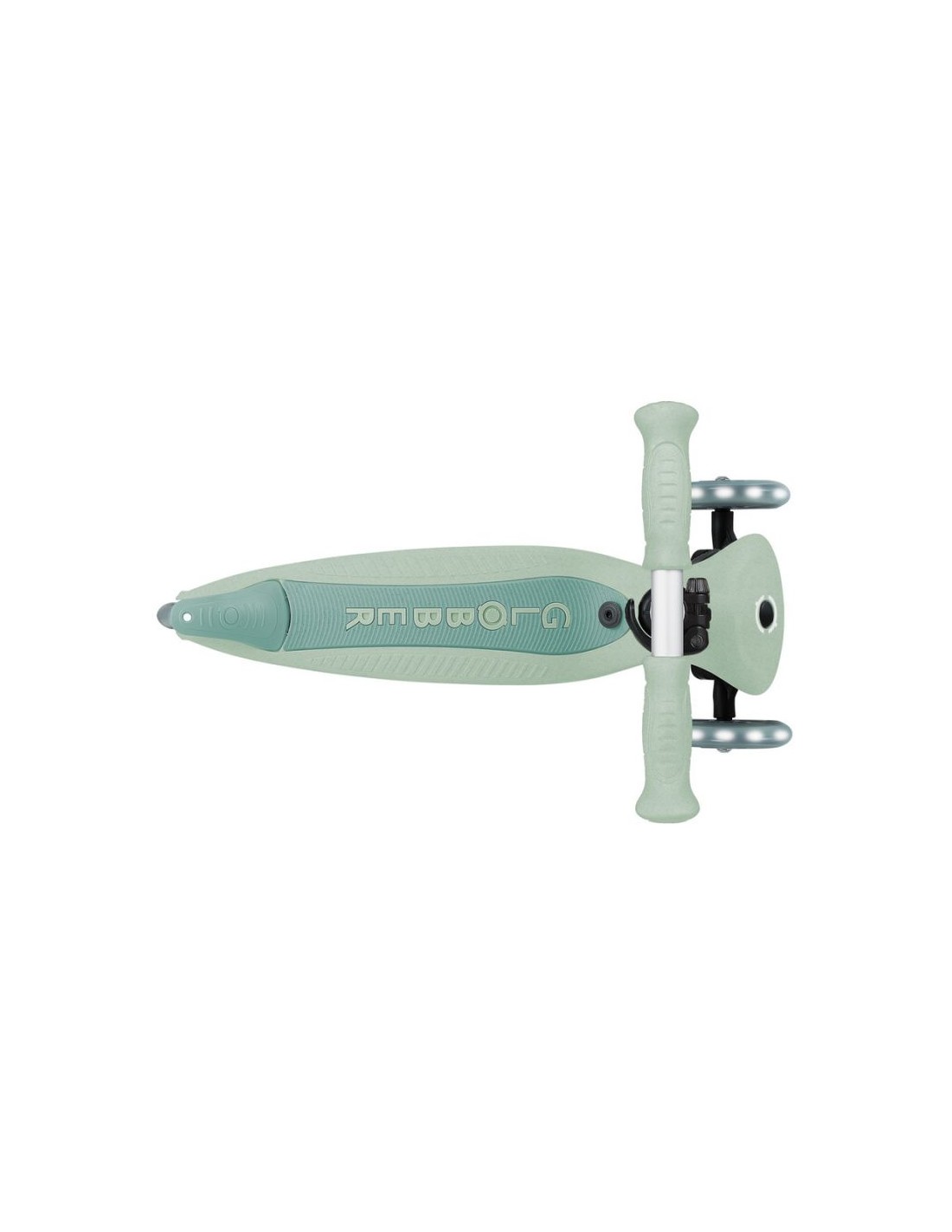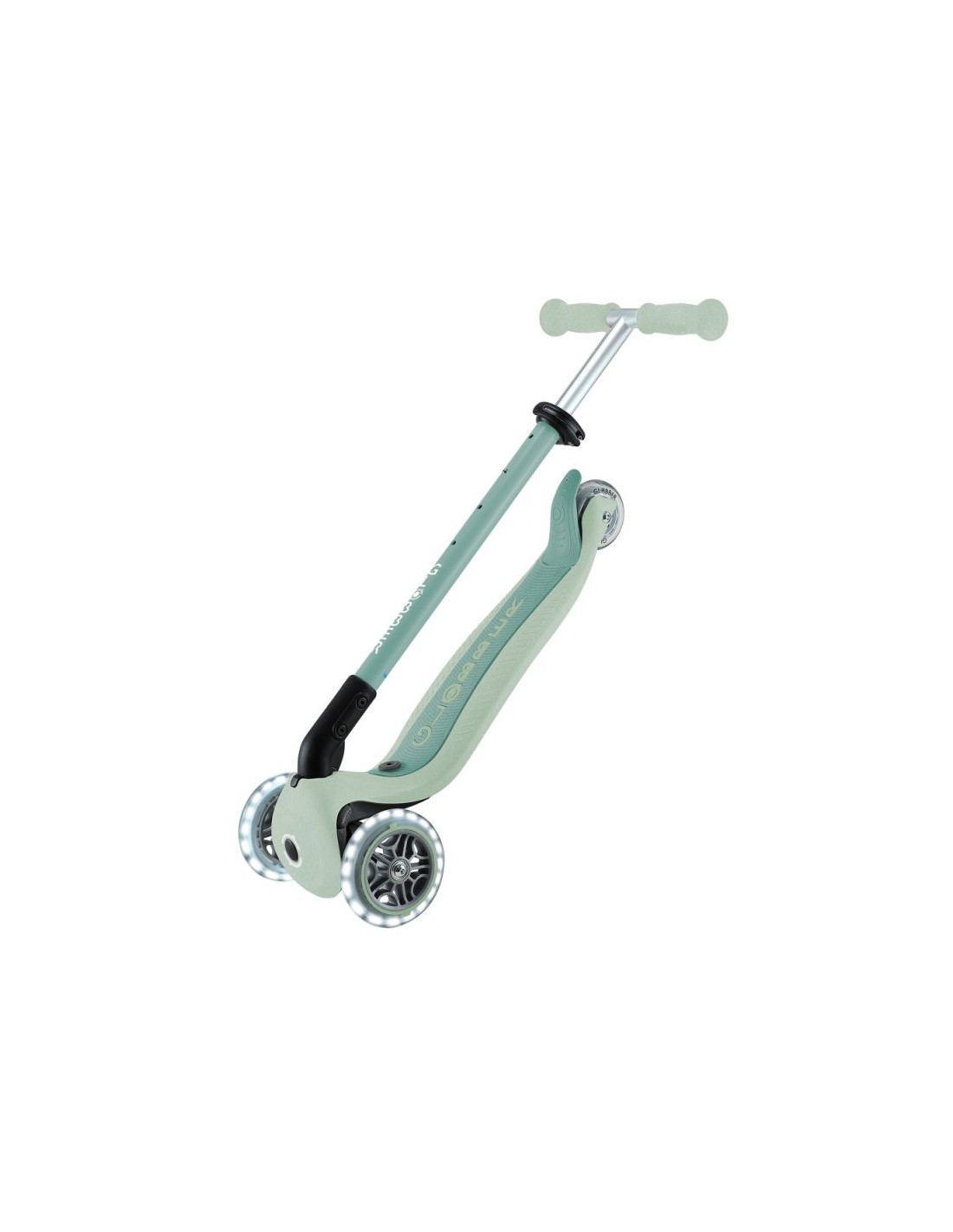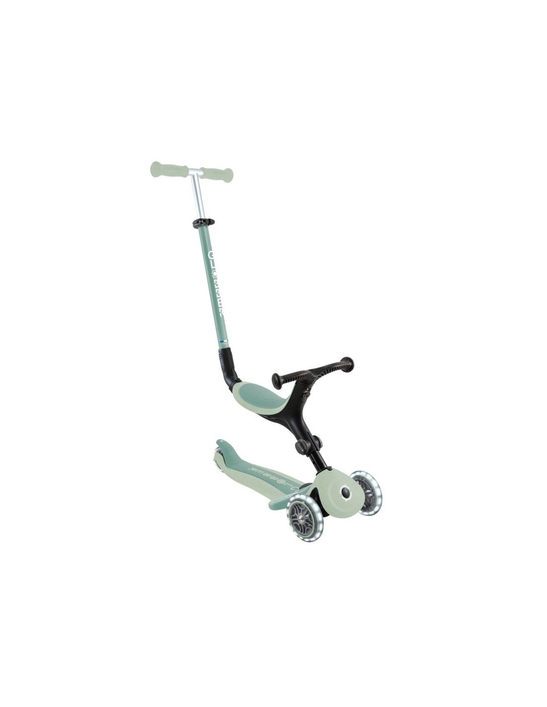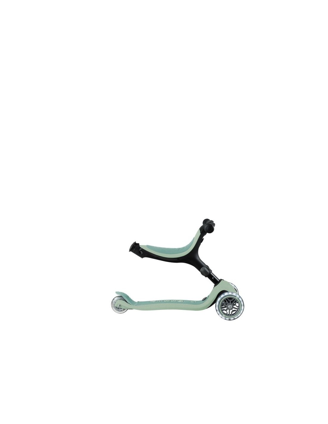 GO • UP Active Lights ECOLOGIC An eco-friendly all-in-one scooter with a seat for small children, made from 100% recycled plastic and organic wheat straw*, and equipped with light-up wheels. The vehicle offers 3 modes: ride-on car with handle for parents (15 months – 3 years) tricycle – balance bike (15 months – 3 years) scooter with 4-level height adjustment and foldable structure (3-9+ years) Simple, tool-free and intuitive transformation between modes using a solidly designed combination of buttons and knobs. The patented folding system allows for convenient transport and storage of the vehicle. The patented steering lock system allows for straight-line driving only. This option is useful for beginners; once your child has mastered balance, you can restore full control with a single button. The vehicle is equipped with light-up wheels that flash white while driving and do not require the use of any batteries. Made from 100% recycled plastic to the global GRS standard and biodegradable wheat straw* Eco-friendly packaging made from recycled paper and is plastic-free. GO • UP Active Lights ECOLOGIC is available in four pastel colors inspired by nature: pistachio, peach, blueberry and bilberry. GO • UP Active Lights ECOLOGIC is made of 100% GRS plastic and biodegradable wheat straw*. GRS is an international protocol that verifies the recycled content of end products. Using GRS plastic saves tons of waste from landfills and mitigates the environmental impact of production. Wheat straw is a 100% renewable, biodegradable bioplastic derived from agricultural waste. Using wheat straw diverts waste and helps decompose other plastics. The plastic maintains its structural integrity and is 100% child-safe. Choose Globber. Choose greener! 100% tool-free design 100% tool-free design allows you to easily switch between different modes without the need for tools or screws – GO • UP Active Lights ECOLOGIC has spring-loaded buttons and knobs that allow for a smooth transition from ride-on to scooter mode. Adjustable seat and handlebar for maximum comfort The eco-friendly GO • UP Active Lights ECOLOGIC scooter with a seat has adjustment functions for maximum comfort: TPR saddle with 2-stage height adjustment, adjustable using a side knob without tools 4-step steering wheel adjustment, so the vehicle \”grows\” with the child. Powerful brake The extra long and wide composite rear brake ensures effective braking. Additional footrest The removable footrest provides additional comfort and safety when riding in ride-on mode. It allows the feet to rest securely while the parent controls the vehicle. Solid platform and durable wheels with LED diodes GO • UP Active Lights ECOLOGIC is equipped with a low, metal-reinforced structure that can withstand up to 50 kg and a wide, non-slip composite deck for a safe scooter ride. High-quality, high-rebound, 121mm diameter PU-molded front wheels mounted on ABEC 5 bearings and an 80mm diameter PU-molded rear wheel provide a smooth ride. The front wheels are equipped with LED lights that flash white while riding. Batteries are not required for the wheels. Patented steering lock system The GO • UP Active Lights ECOLOGIC features Globber\’s patented steering lock system, which locks the front wheels of the scooter to only move forward and backward, so kids gain confidence while riding their scooter while developing their balance skills. To enter full steering mode and enable balance steering, simply release the handlebar lock button located at the front of the scooter. Patented folding system Effortlessly carry and store your GO • UP Active Lights ECOLOGIC in a compact form! Featuring a patented folding system, easily fold this 3-wheel scooter into stroller mode to carry it around or roll it after a day of scootering fun. LIBRA DIMENSIONS (height / length / width) SEAT HEIGHT stroller 3.86 kg 77.5- 95.5 x 60.02 – 67 x 28 cm 25.5 – 29 cm bike – ride-on 3.23 kg 37 – 41 x 57.5 x 26.5 cm scooter 2.72 kg 67.5 – 82.5 x 57.5 x 28 cm This eco-friendly all-in-one scooter with a seat converts into a ride-on bike, a walker, and a toddler scooter. The ride-on and walker modes are designed for toddlers aged 15-36 months, while the scooter mode is suitable for children aged 3-9+. Made from 100% GRS plastic and biodegradable wheat straw* as a sustainable choice for families. 100% tool-free design allows you to easily switch between different modes without the need for tools or screws – the GO • UP Active Lights ECOLOGIC has spring-loaded buttons and knobs that seamlessly transition from ride-on to scooter mode. The patented folding system allows for convenient folding and offers a stroller mode. Thanks to the easy-to-use side button, you can easily carry and store the GO•UP Active Lights ECOLOGIC in a small space. Globber\’s patented steering lock system prevents the front wheels from turning, helping children learn and master balance. Adjustable Scooter with Seat: 2-position TPR seat height adjustment (25.5cm or 29cm from the ground), adjusted by a tool-free knob on the side and 4-position T-bar height adjustment (67.5cm, 72.5cm, 77.5cm, 82.5cm from the ground) for a comfortable ride. The low-profile, metal-reinforced structure supports up to 50 kg and features a wide, non-slip composite deck for a safe ride. A long, wide, removable footrest provides added comfort and safety when using the scooter. High-quality, high-rebound 121mm PU cast front wheels mounted on ABEC 5 bearings and a single 80mm PU cast rear wheel provide a smooth ride. An extra-long and wide composite rear brake ensures effective braking and extends wheel life. (* in all applicable elements)