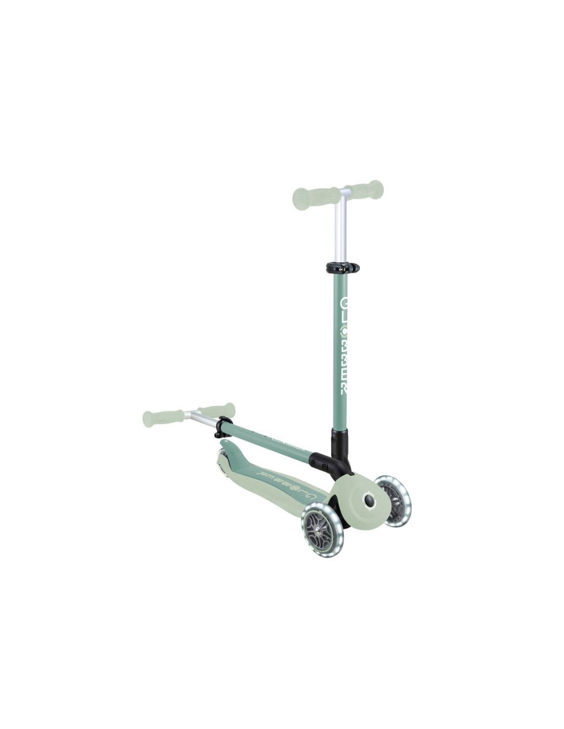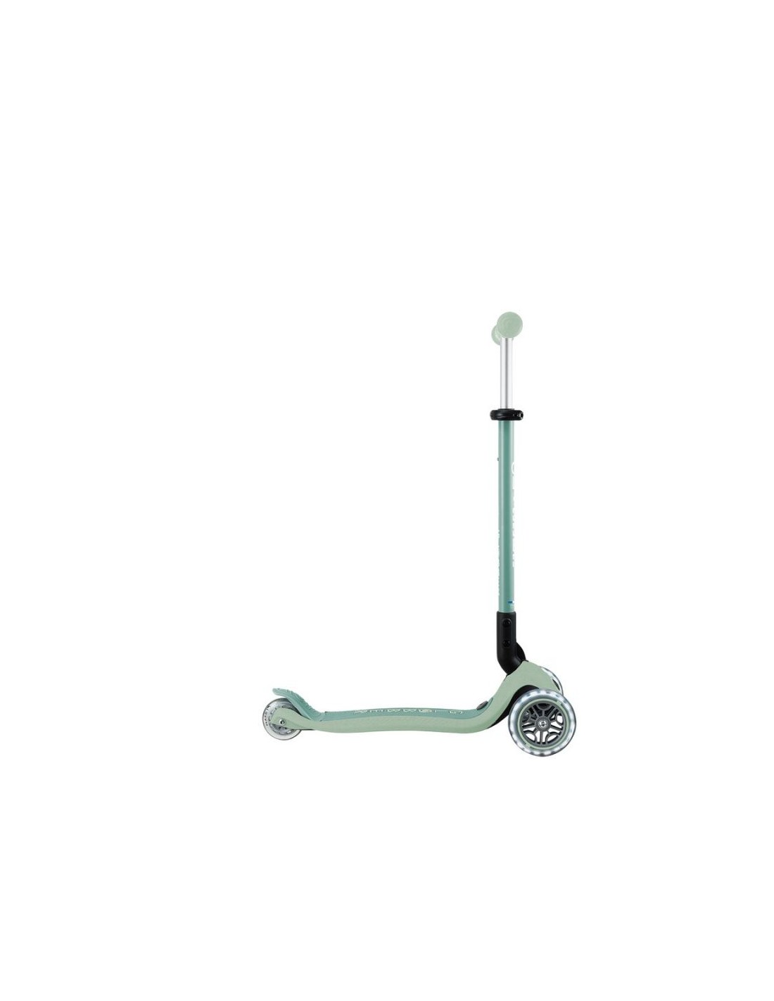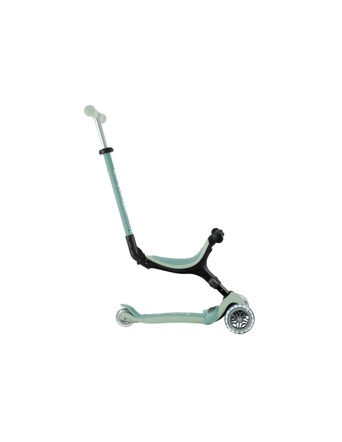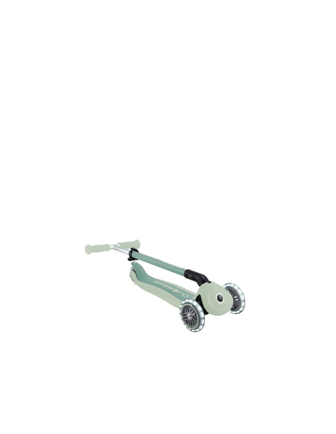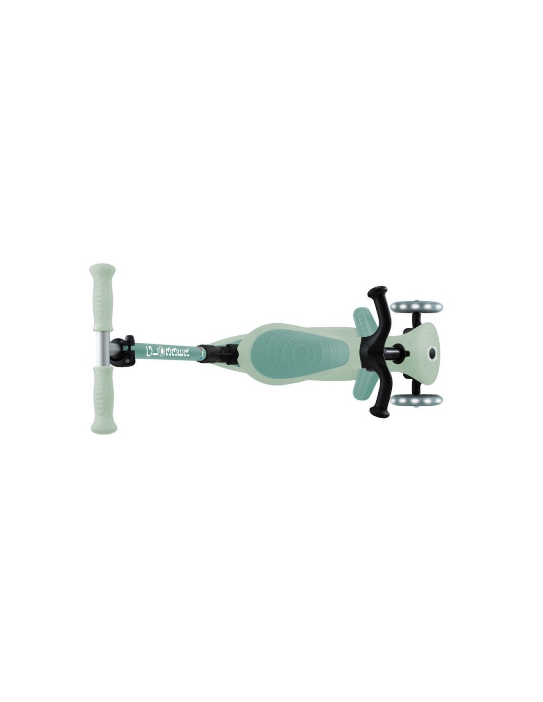 GO • UP Active Lights ECOLOGIC An eco-friendly all-in-one scooter with a seat for small children, made from 100% recycled plastic and organic wheat straw*, and equipped with light-up wheels. The vehicle offers 3 modes: ride-on car with handle for parents (15 months – 3 years) tricycle – balance bike (15 months – 3 years) scooter with 4-level height adjustment and foldable structure (3-9+ years) Simple, tool-free and intuitive transformation between modes using a solidly designed combination of buttons and knobs. The patented folding system allows for convenient transport and storage of the vehicle. The patented steering lock system allows for straight-line driving only. This option is useful for beginners; once your child has mastered balance, you can restore full control with a single button. The vehicle is equipped with light-up wheels that flash white while driving and do not require the use of any batteries. Made from 100% recycled plastic to the global GRS standard and biodegradable wheat straw* Eco-friendly packaging made from recycled paper and is plastic-free. GO • UP Active Lights ECOLOGIC is available in four pastel colors inspired by nature: pistachio, peach, blueberry and bilberry. GO • UP Active Lights ECOLOGIC is made of 100% GRS plastic and biodegradable wheat straw*. GRS is an international protocol that verifies the recycled content of end products. Using GRS plastic saves tons of waste from landfills and mitigates the environmental impact of production. Wheat straw is a 100% renewable, biodegradable bioplastic derived from agricultural waste. Using wheat straw diverts waste and helps decompose other plastics. The plastic maintains its structural integrity and is 100% child-safe. Choose Globber. Choose greener! 100% tool-free design 100% tool-free design allows you to easily switch between different modes without the need for tools or screws – GO • UP Active Lights ECOLOGIC has spring-loaded buttons and knobs that allow for a smooth transition from ride-on to scooter mode. Adjustable seat and handlebar for maximum comfort The eco-friendly GO • UP Active Lights ECOLOGIC scooter with a seat has adjustment functions for maximum comfort: TPR saddle with 2-stage height adjustment, adjustable using a side knob without tools 4-step steering wheel adjustment, so the vehicle \”grows\” with the child. Powerful brake The extra long and wide composite rear brake ensures effective braking. Additional footrest The removable footrest provides additional comfort and safety when riding in ride-on mode. It allows the feet to rest securely while the parent controls the vehicle. Solid platform and durable wheels with LED diodes GO • UP Active Lights ECOLOGIC is equipped with a low, metal-reinforced structure that can withstand up to 50 kg and a wide, non-slip composite deck for a safe scooter ride. High-quality, high-rebound, 121mm diameter PU-molded front wheels mounted on ABEC 5 bearings and an 80mm diameter PU-molded rear wheel provide a smooth ride. The front wheels are equipped with LED lights that flash white while riding. Batteries are not required for the wheels. Patented steering lock system The GO • UP Active Lights ECOLOGIC features Globber\’s patented steering lock system, which locks the front wheels of the scooter to only move forward and backward, so kids gain confidence while riding their scooter while developing their balance skills. To enter full steering mode and enable balance steering, simply release the handlebar lock button located at the front of the scooter. Patented folding system Effortlessly carry and store your GO • UP Active Lights ECOLOGIC in a compact form! Featuring a patented folding system, easily fold this 3-wheel scooter into stroller mode to carry it around or roll it after a day of scootering fun. LIBRA DIMENSIONS (height / length / width) SEAT HEIGHT stroller 3.86 kg 77.5- 95.5 x 60.02 – 67 x 28 cm 25.5 – 29 cm bike – ride-on 3.23 kg 37 – 41 x 57.5 x 26.5 cm scooter 2.72 kg 67.5 – 82.5 x 57.5 x 28 cm This eco-friendly all-in-one scooter with a seat converts into a ride-on bike, a walker, and a toddler scooter. The ride-on and walker modes are designed for toddlers aged 15-36 months, while the scooter mode is suitable for children aged 3-9+. Made from 100% GRS plastic and biodegradable wheat straw* as a sustainable choice for families. 100% tool-free design allows you to easily switch between different modes without the need for tools or screws – the GO • UP Active Lights ECOLOGIC has spring-loaded buttons and knobs that seamlessly transition from ride-on to scooter mode. The patented folding system allows for convenient folding and offers a stroller mode. Thanks to the easy-to-use side button, you can easily carry and store the GO•UP Active Lights ECOLOGIC in a small space. Globber\’s patented steering lock system prevents the front wheels from turning, helping children learn and master balance. Adjustable Scooter with Seat: 2-position TPR seat height adjustment (25.5cm or 29cm from the ground), adjusted by a tool-free knob on the side and 4-position T-bar height adjustment (67.5cm, 72.5cm, 77.5cm, 82.5cm from the ground) for a comfortable ride. The low-profile, metal-reinforced structure supports up to 50 kg and features a wide, non-slip composite deck for a safe ride. A long, wide, removable footrest provides added comfort and safety when using the scooter. High-quality, high-rebound 121mm PU cast front wheels mounted on ABEC 5 bearings and a single 80mm PU cast rear wheel provide a smooth ride. An extra-long and wide composite rear brake ensures effective braking and extends wheel life. (* in all applicable elements)