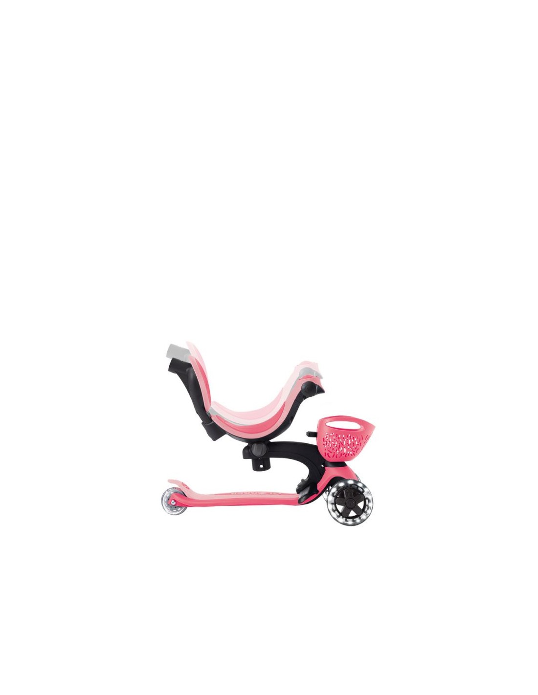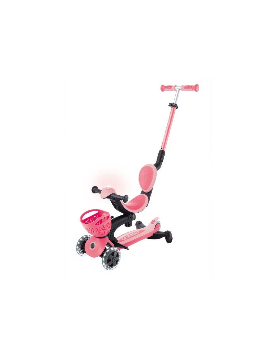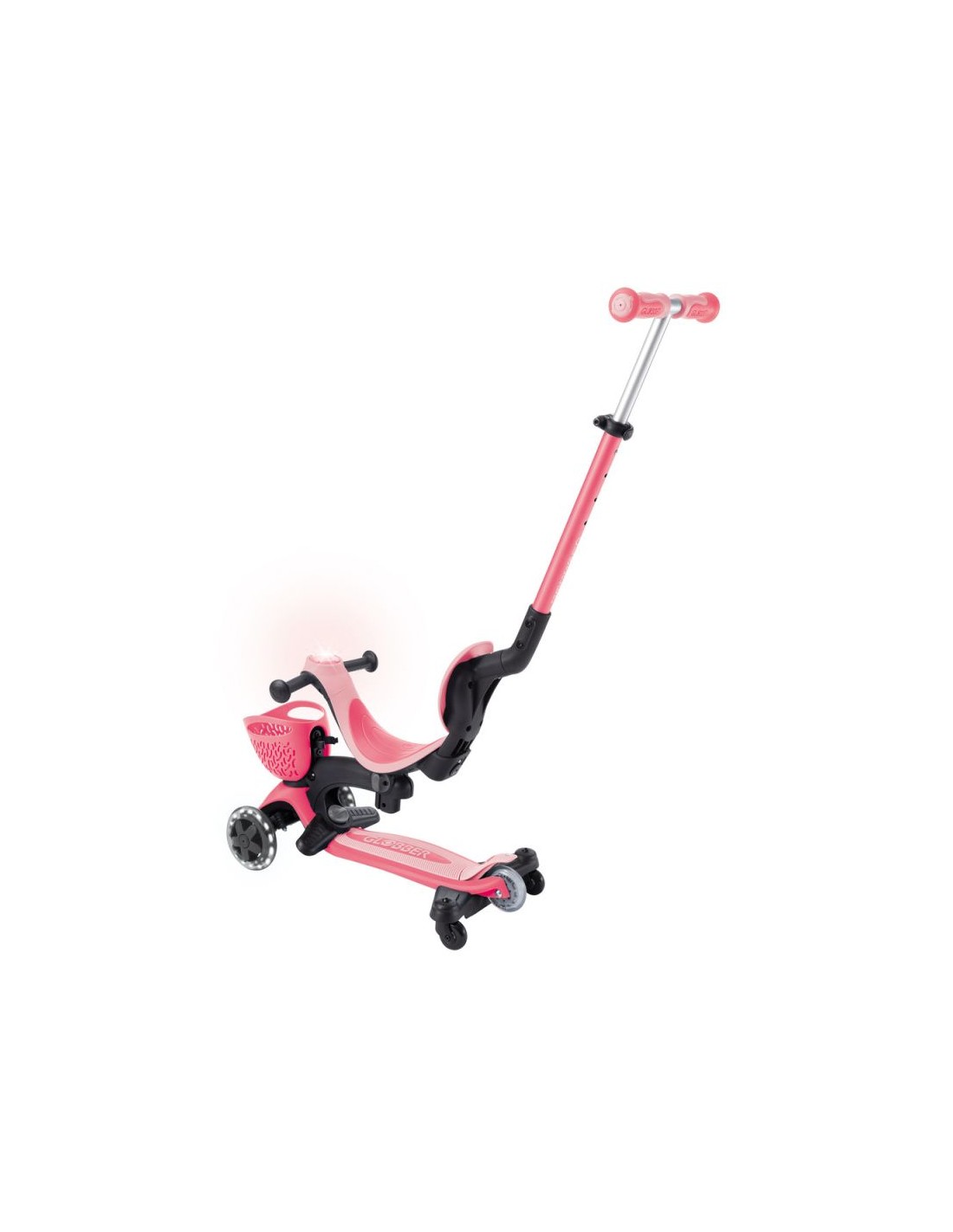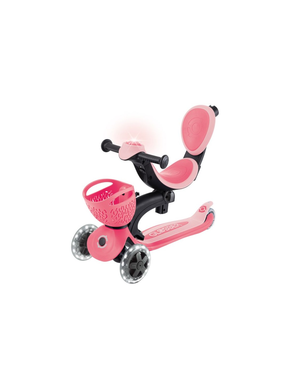 GO • UP BABY LEARN 360 FLASH LIGHTS A multi-functional all-in-one ride-on vehicle with a seat for small children, made from recycled TBC plastic, featuring light-up wheels, a light on the handlebar, a basket, a backrest and side wheels. The vehicle offers 3 modes: ride-on car with handle for parents (15 months – 3 years) tricycle – balance bike (15 months – 3 years) scooter with 3-level height adjustment and foldable structure (3-6+ years) Simple, tool-free and intuitive transformation between modes using a solidly designed combination of buttons and knobs. The patented folding system allows for convenient transport and storage of the vehicle. The patented steering lock system allows for straight-line driving only. This option is useful for beginners; once your child has mastered balance, you can restore full control with a single button. The vehicle is equipped with light-up wheels that flash white while driving and does not require the use of any batteries. Made from 100% recycled TBC plastic (in reusable components). 100% tool-free design 100% tool-free design lets you easily switch between different modes without tools or screws – the GO • UP features spring-loaded buttons and knobs that allow for a seamless transition from ride-on to scooter mode. Solid platform and durable wheels with LED diodes GO • UP Active Lights ECOLOGIC is equipped with a low, metal-reinforced structure that can withstand up to 50 kg and a wide, non-slip composite deck for a safe scooter ride. High-quality, high-rebound, 121mm diameter PU-molded front wheels mounted on ABEC 5 bearings and an 80mm diameter PU-molded rear wheel provide a smooth ride. The front wheels are equipped with LED lights that flash white while riding. Batteries are not required for the wheels. Patented steering lock system The GO • UP Baby features Globber\’s patented steering lock system, which locks the scooter\’s front wheels to only move forward and backward, so kids gain confidence while scootering while developing their balance skills. To enter full steering mode and enable balance steering, simply release the handlebar lock button located at the front of the scooter. Patented folding system Effortlessly carry and store your GO • UP Baby in a compact form! Featuring a patented folding system, easily fold this 3-wheel scooter into stroller mode to carry it around or roll it after a day of scootering fun. Amenities for the best comfort TPR saddle with 3-step height adjustment and comfortable backrest. Footrest – The removable footrest provides additional comfort and safety when riding in ride-on mode. It allows the feet to rest securely while the parent controls the vehicle. The basket at the front of the scooter can be detached when not needed. Light module on the handlebar – exclusive LED light with vibration function. Light-up wheels – the front wheels of the vehicle are equipped with LEDs that flash white while driving. Side wheels – additional rear wheels with 360-degree rotation – make it easier for parents to control the ride-on. They can be easily removed when not in use. Adjustable height on 3 levels – easy and quick adjustment of the parent handlebar height and handlebar height in scooter mode