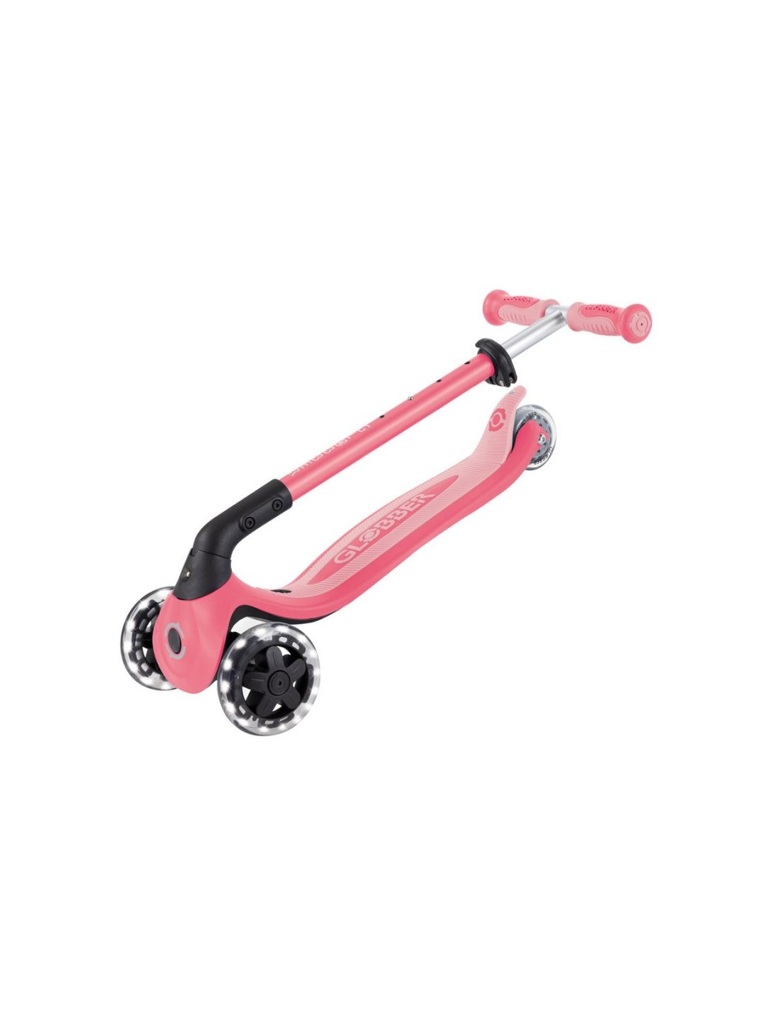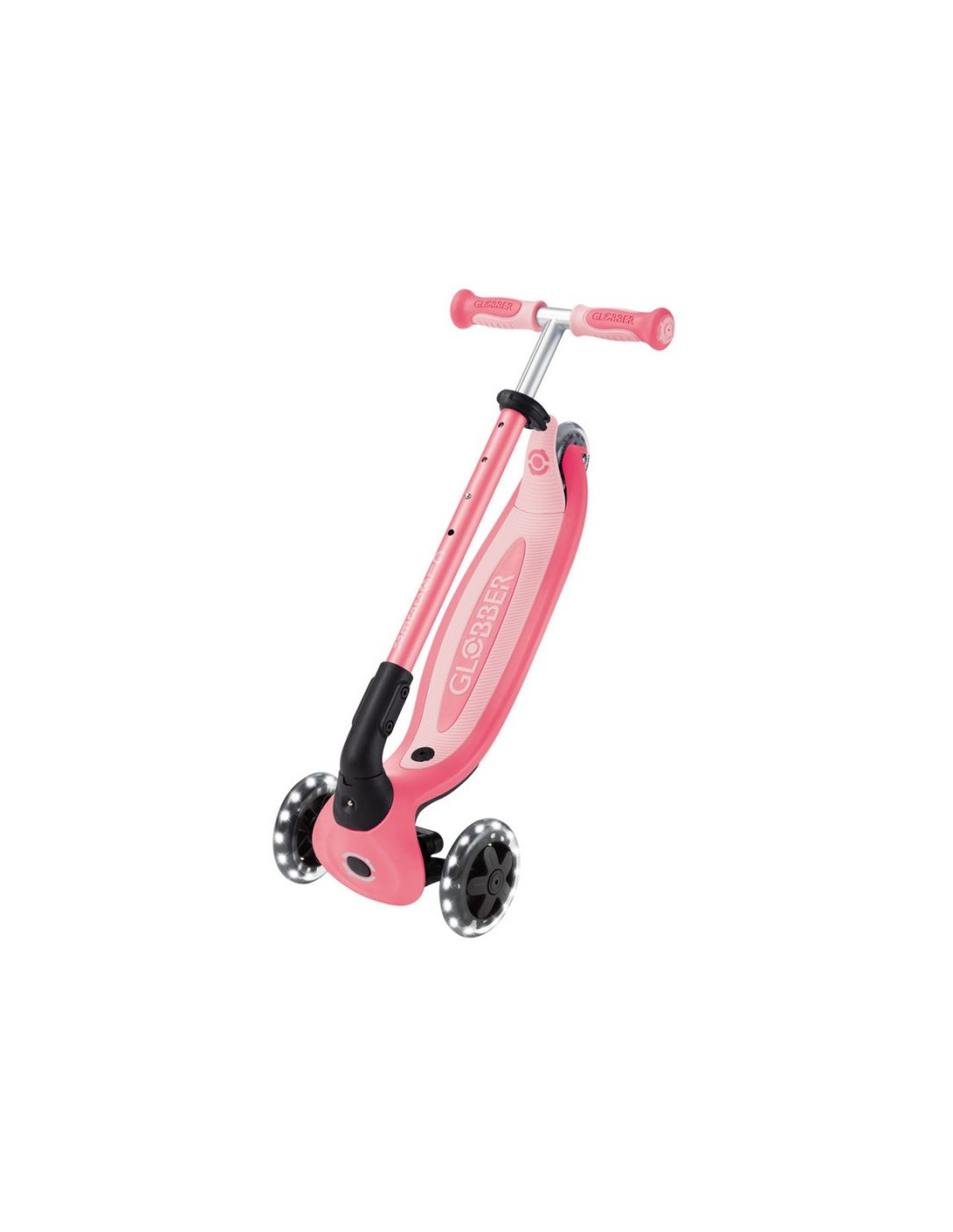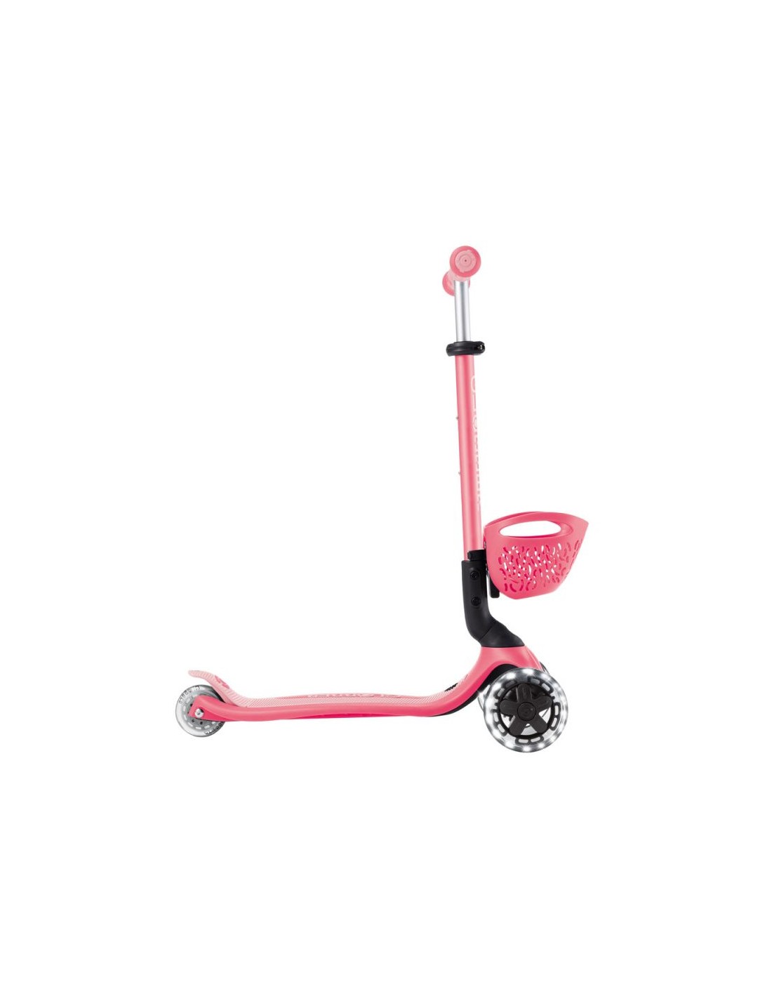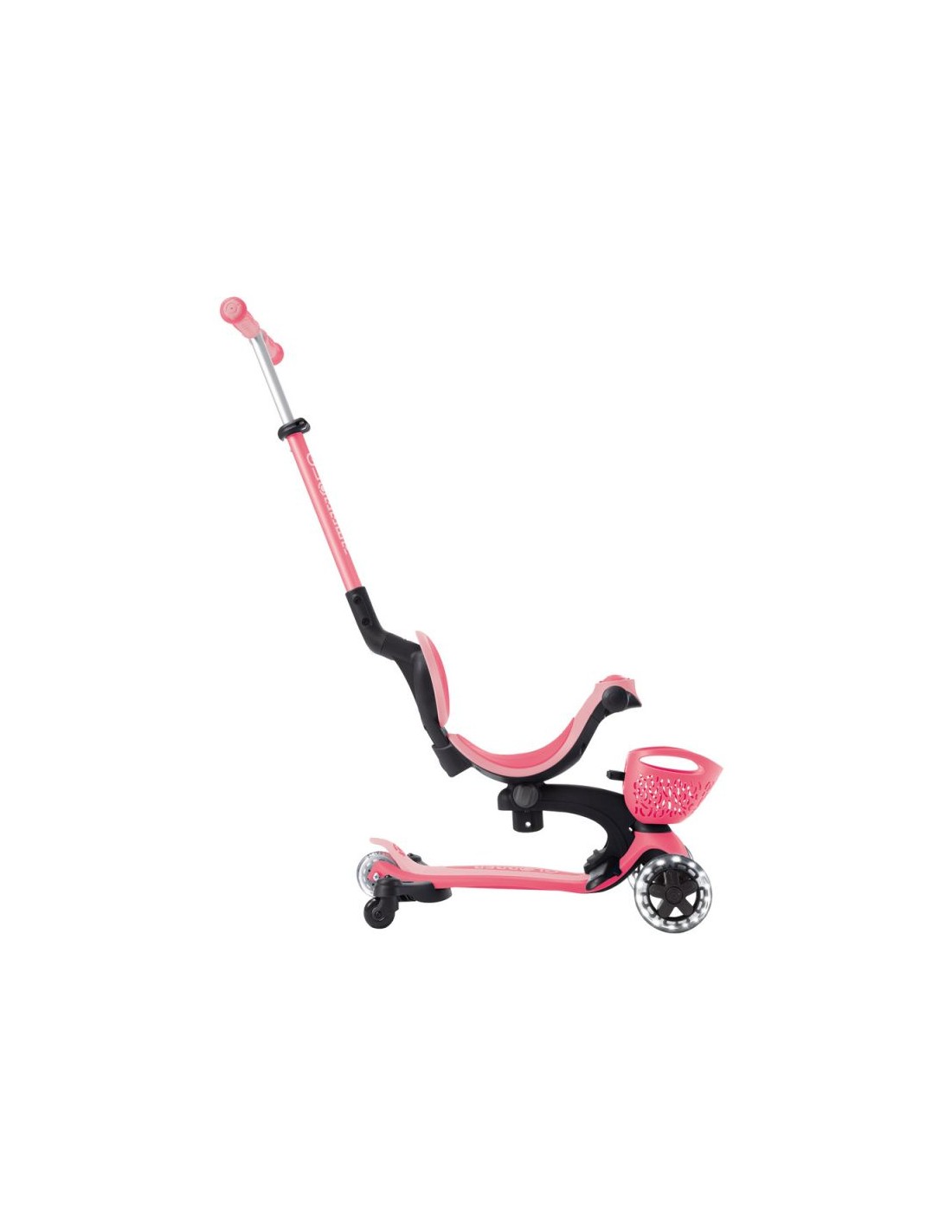 GO • UP BABY LEARN 360 FLASH LIGHTS A multi-functional all-in-one ride-on vehicle with a seat for small children, made from recycled TBC plastic, featuring light-up wheels, a light on the handlebar, a basket, a backrest and side wheels. The vehicle offers 3 modes: ride-on car with handle for parents (15 months – 3 years) tricycle – balance bike (15 months – 3 years) scooter with 3-level height adjustment and foldable structure (3-6+ years) Simple, tool-free and intuitive transformation between modes using a solidly designed combination of buttons and knobs. The patented folding system allows for convenient transport and storage of the vehicle. The patented steering lock system allows for straight-line driving only. This option is useful for beginners; once your child has mastered balance, you can restore full control with a single button. The vehicle is equipped with light-up wheels that flash white while driving and does not require the use of any batteries. Made from 100% recycled TBC plastic (in reusable components). 100% tool-free design 100% tool-free design lets you easily switch between different modes without tools or screws – the GO • UP features spring-loaded buttons and knobs that allow for a seamless transition from ride-on to scooter mode. Solid platform and durable wheels with LED diodes GO • UP Active Lights ECOLOGIC is equipped with a low, metal-reinforced structure that can withstand up to 50 kg and a wide, non-slip composite deck for a safe scooter ride. High-quality, high-rebound, 121mm diameter PU-molded front wheels mounted on ABEC 5 bearings and an 80mm diameter PU-molded rear wheel provide a smooth ride. The front wheels are equipped with LED lights that flash white while riding. Batteries are not required for the wheels. Patented steering lock system The GO • UP Baby features Globber\’s patented steering lock system, which locks the scooter\’s front wheels to only move forward and backward, so kids gain confidence while scootering while developing their balance skills. To enter full steering mode and enable balance steering, simply release the handlebar lock button located at the front of the scooter. Patented folding system Effortlessly carry and store your GO • UP Baby in a compact form! Featuring a patented folding system, easily fold this 3-wheel scooter into stroller mode to carry it around or roll it after a day of scootering fun. Amenities for the best comfort TPR saddle with 3-step height adjustment and comfortable backrest. Footrest – The removable footrest provides additional comfort and safety when riding in ride-on mode. It allows the feet to rest securely while the parent controls the vehicle. The basket at the front of the scooter can be detached when not needed. Light module on the handlebar – exclusive LED light with vibration function. Light-up wheels – the front wheels of the vehicle are equipped with LEDs that flash white while driving. Side wheels – additional rear wheels with 360-degree rotation – make it easier for parents to control the ride-on. They can be easily removed when not in use. Adjustable height on 3 levels – easy and quick adjustment of the parent handlebar height and handlebar height in scooter mode