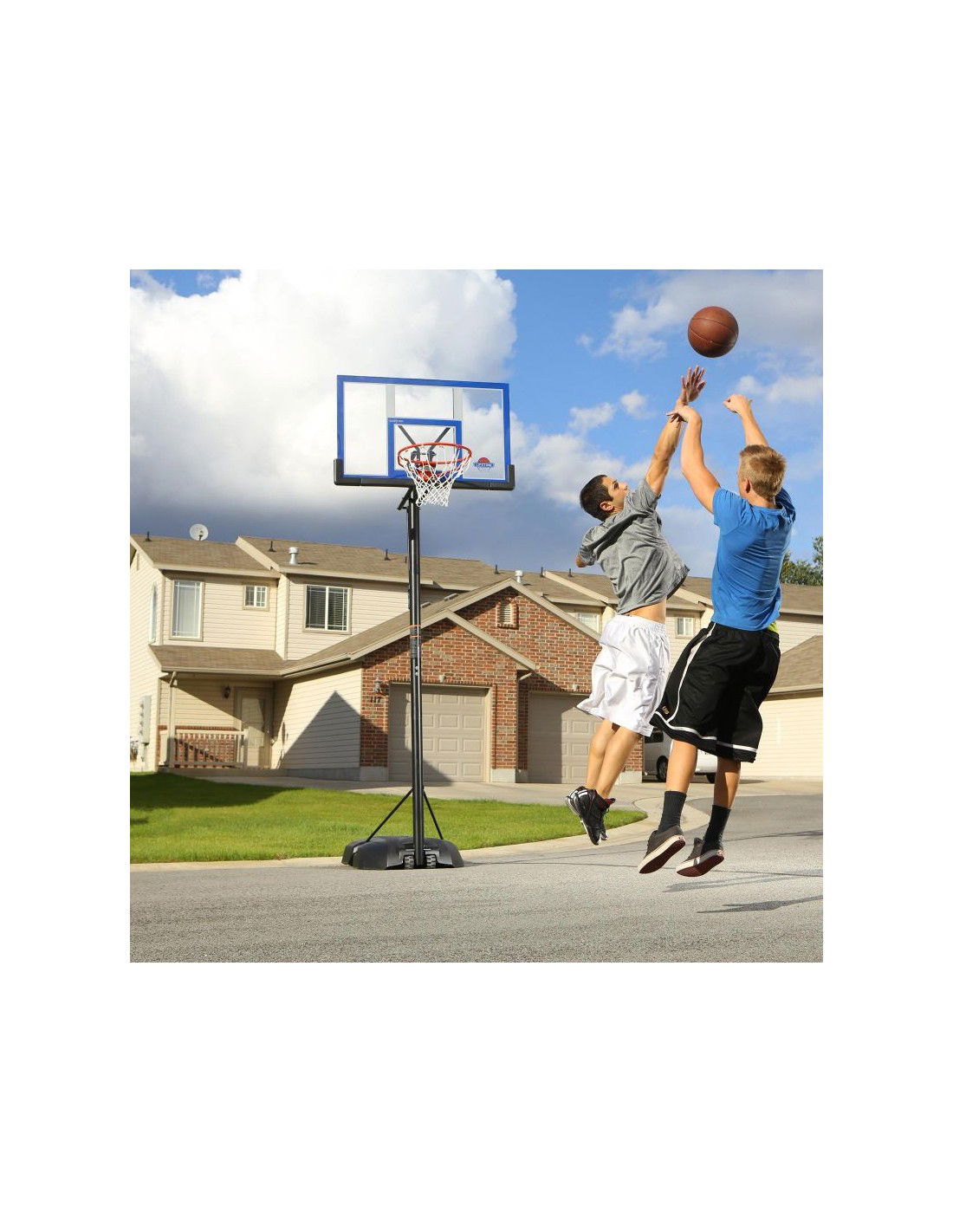 Η φορητή βάση μπάσκετ διαθέτει ταμπλό 48\” κατασκευασμένο με τεχνολογία Steel-Framed Shatter-Proof. Η τεχνολογία Shatter-Proof εγγυάται μακροχρόνια ανθεκτικότητα και αντοχή στις κρούσεις χάρη στην επικάλυψη από πολυκαρβονικό Makrolon® υψηλής ποιότητας. Η τεχνολογία Steel-Framed είναι ένα ανθεκτικό χαλύβδινο πλαίσιο για το backboard. Η πρόσθετη προστασία του κάτω άκρου του ταμπλό και η τεχνολογία ρύθμισης ύψους Speed ??Shift® στο εύρος από 244 έως 305 cm με το ένα χέρι παρέχουν άνετο και ασφαλές παιχνίδι σε κάθε επίπεδο παιχνιδιού. αδιάβροχο νάιλον πλέγμα και στρογγυλός στύλος με διάμετρο 7,62 cm Ρόλοι μεταφοράς τοποθετημένοι σε σταθερή βάση γεμάτη νερό χωρητικότητας 128 λίτρων εξασφαλίζουν πλήρη κινητικότητα και σταθερότητα της βάσης.