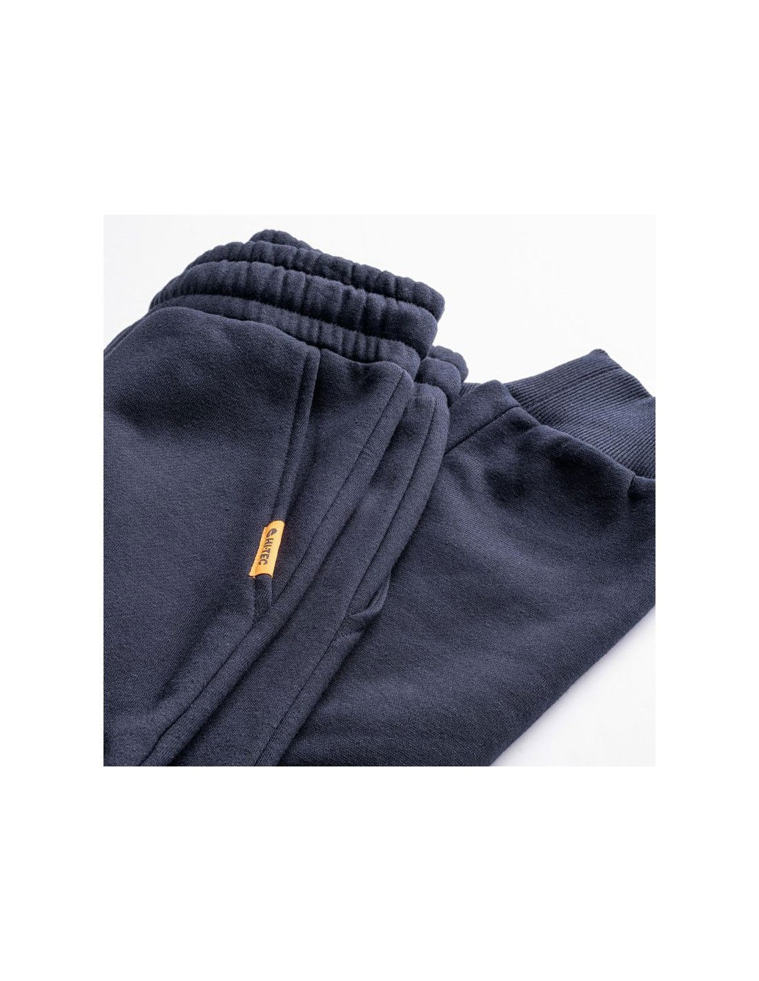 The presented model has two side pockets and additional pockets on the thighs. A wide elastic band in the waist with a string allows for an individual fit.