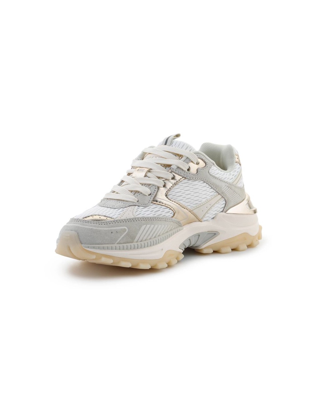 - The shiny gold upper attracts attention, while the lightweight construction and solid sole provide everyday comfort.