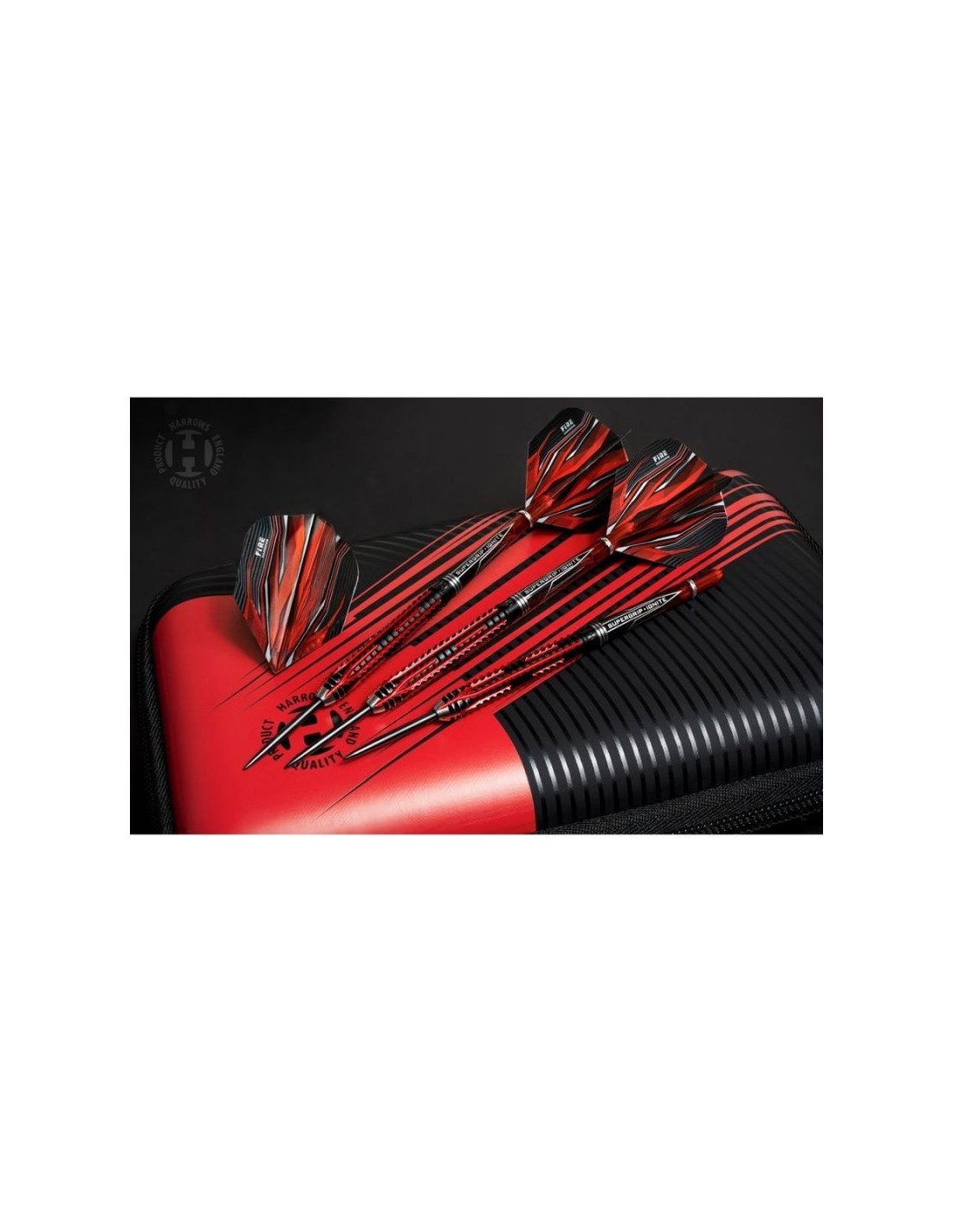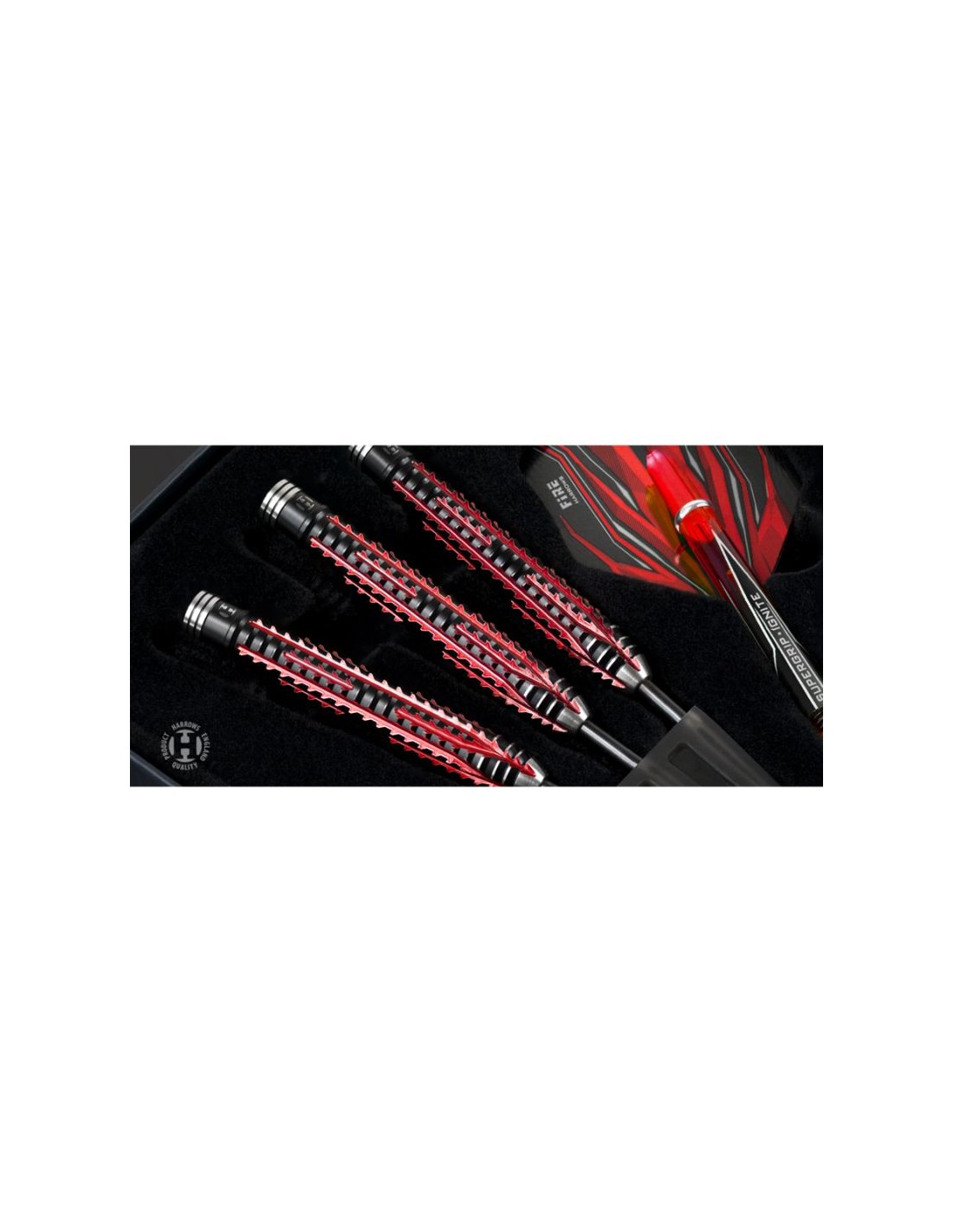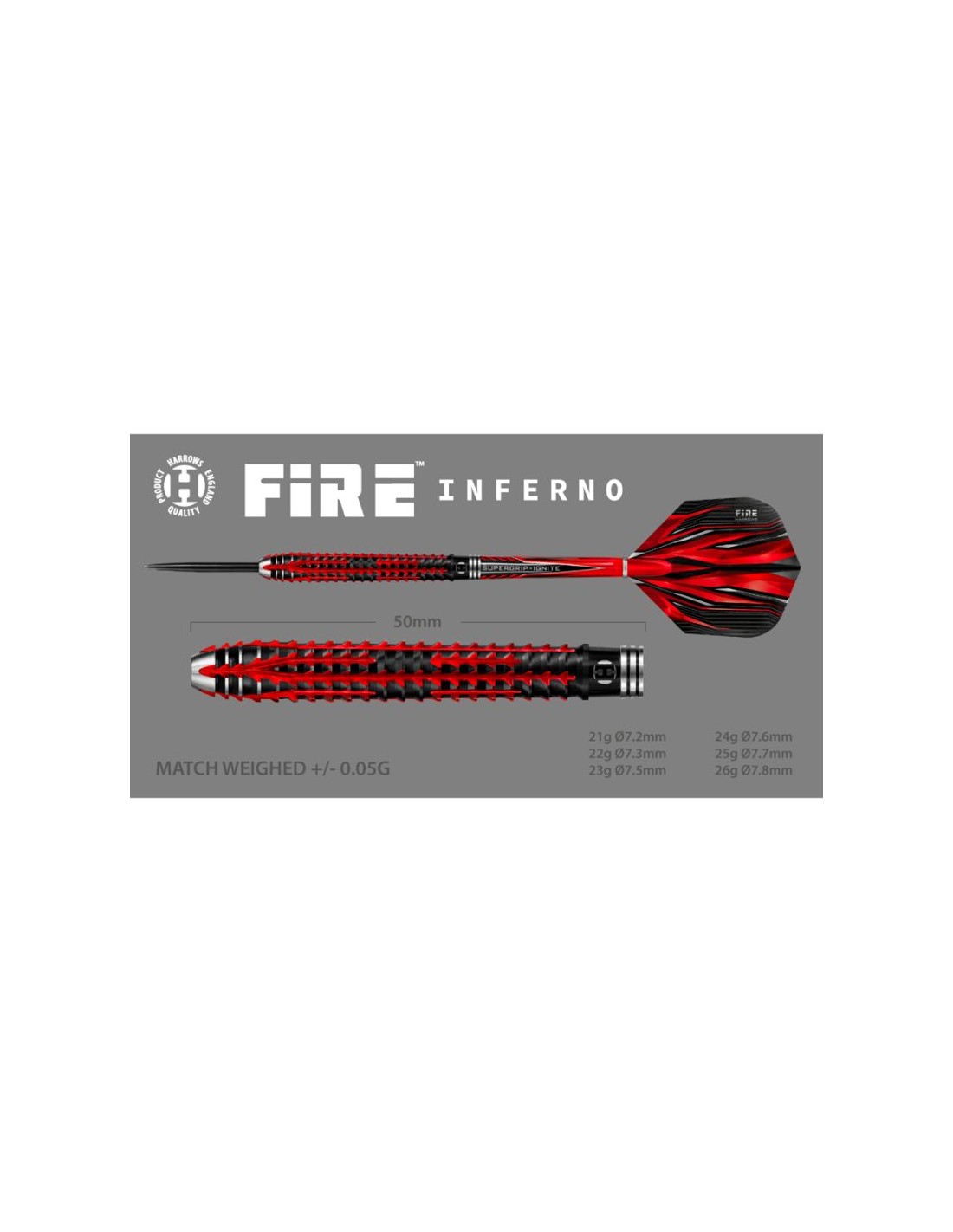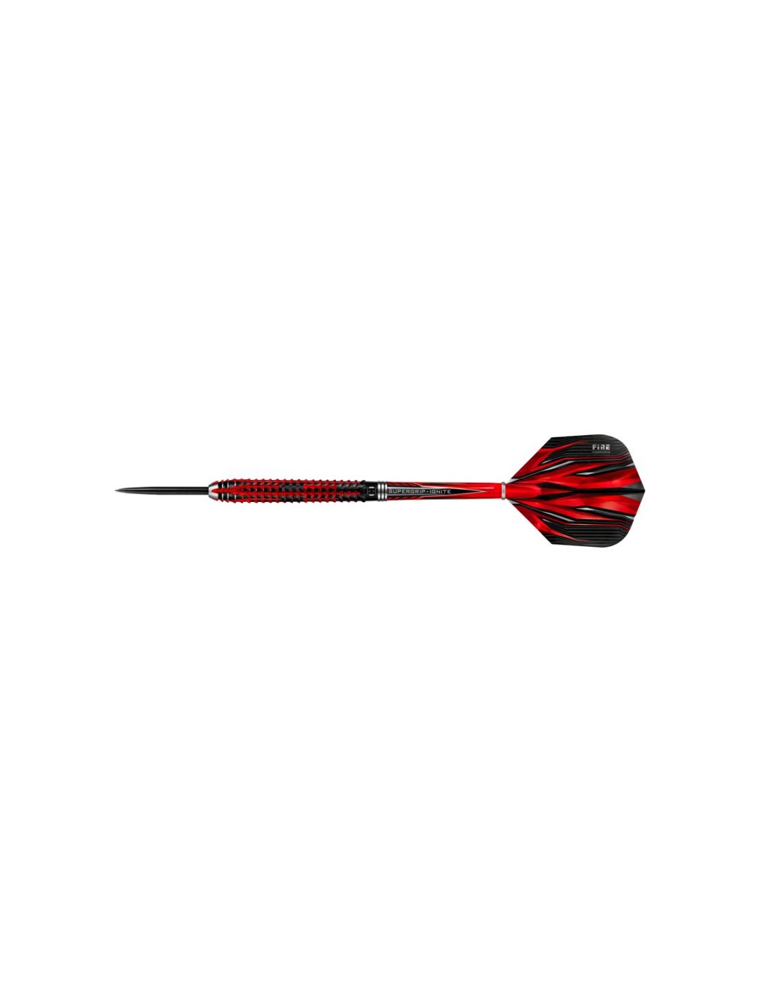 Properties: Fire Inferno darts have been meticulously manufactured using the finest materials and most advanced techniques available. The finest injection molded tungsten 90% Fire Effect – Double sided milling combined with reverse ring cuts for a unique gripping sequence. Slightly tapered barrel. Finished with a strong black titanium nitride and vibrant metallic red coatings. Barrel: 90% tungsten Shaft: Supergrip Fire Ignite Feathers: Prime