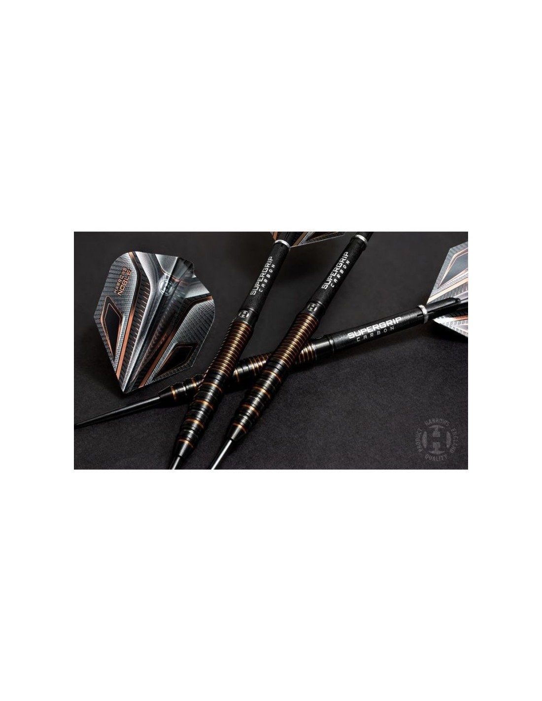 Properties: Noble darts are the pride of the brand, presenting complex processing possibilities and pioneering design. The finest injection molded 90% tungsten. Unique barrel shape with a tapered front and ergonomic, concave rear. Finished in an impressive combination of 3 colors: black, silver and rich gold. Balance accuracy up to +/- 0.05 g. Barrel: 90% tungsten Shaft: Supergrip Carbon Feathers: Prime