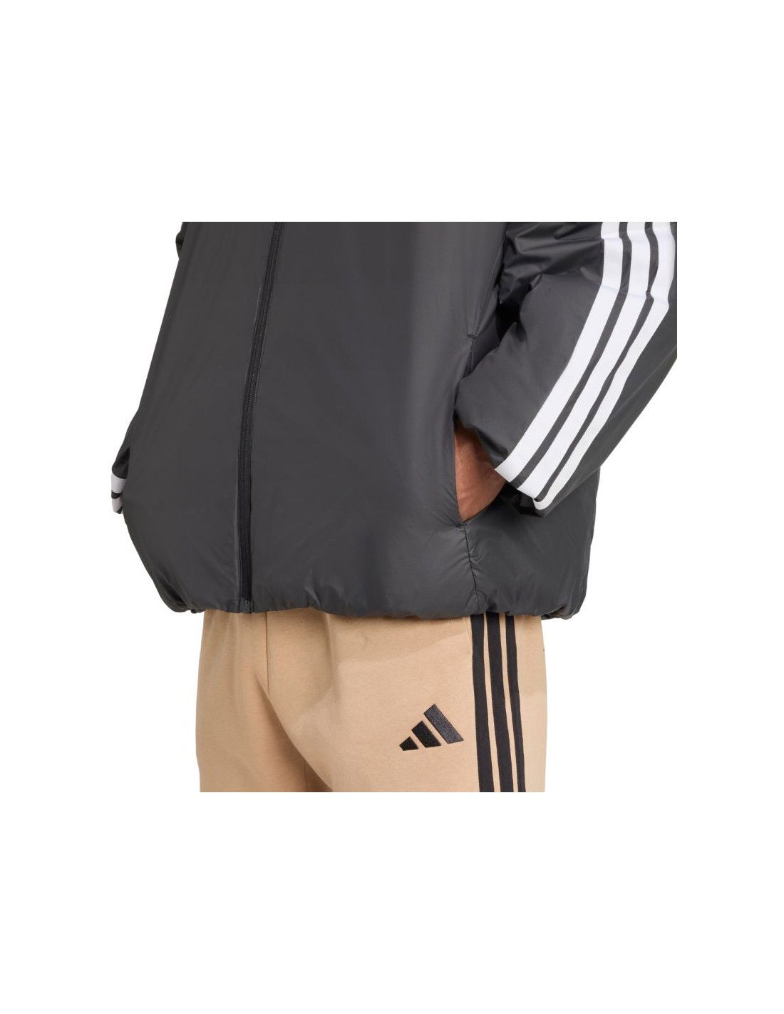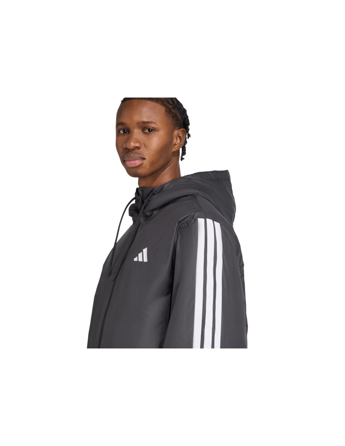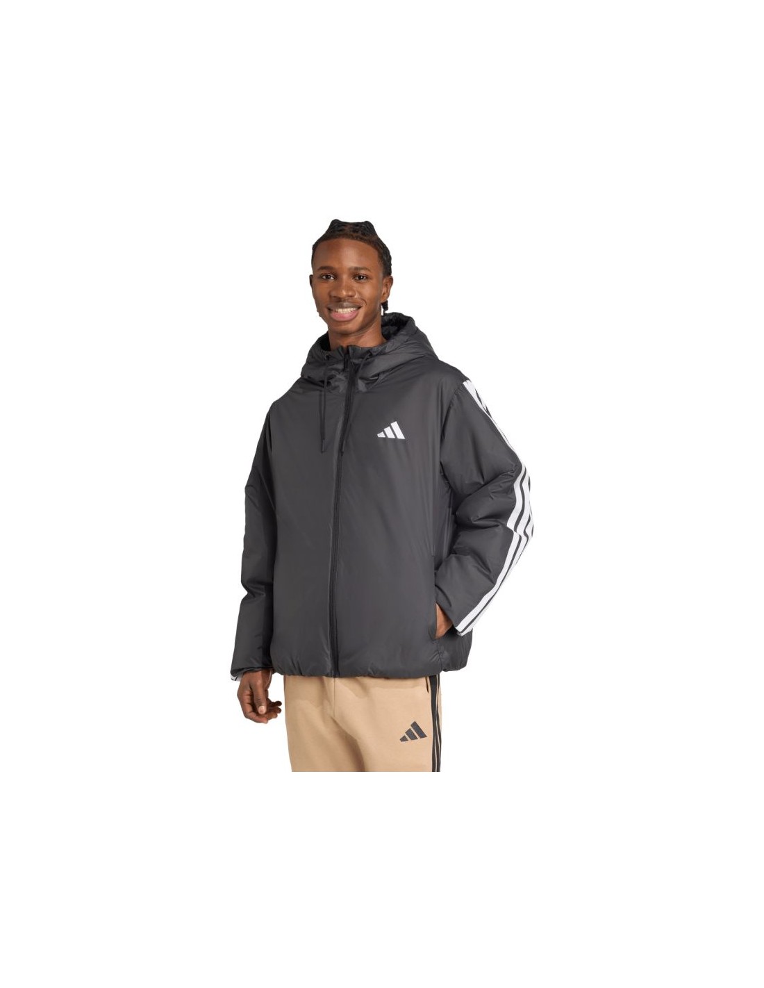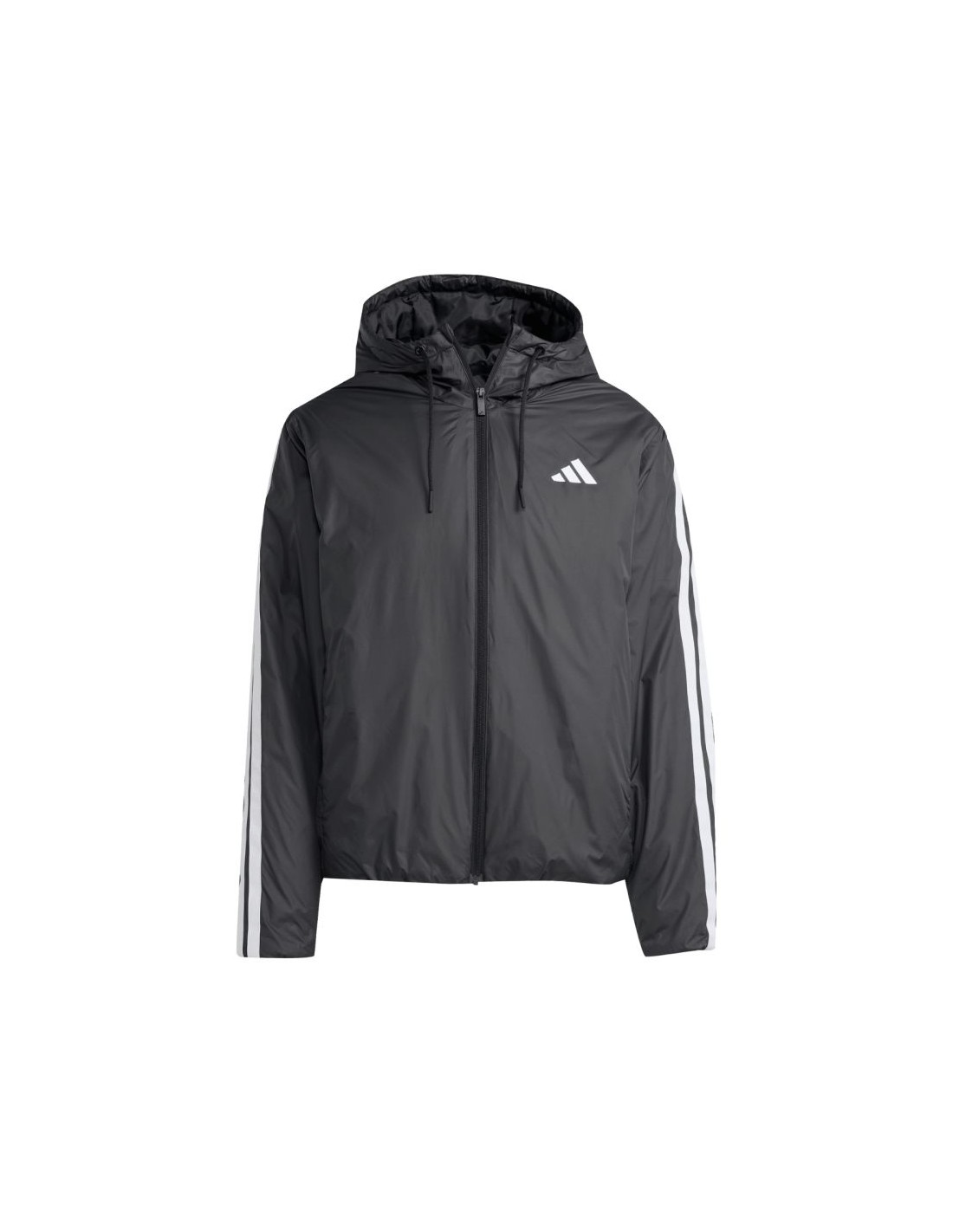 adidas Essentials Climawarm 3-Stripes Insulated Hooded Men\’s Jacket, Black JM4042. This mid-weight adidas men\’s jacket is perfect for transitional periods. Durable polyester construction. DWR-coated fabric reduces moisture absorption. Climawarm technology retains heat and wicks away sweat for comfort. Synthetic fill. Regular fit. Full-length zipper. Front snap pockets. Fixed hood with drawcord adjustment. Elastic cuffs and hem. This model is made from a series of recycled materials and contains 100% recycled content, just one of the proposed solutions that can help end plastic waste. Specifications: Material: 100% recycled polyester. Filling: 100% polyester (synthetic down).