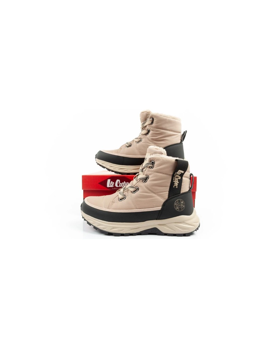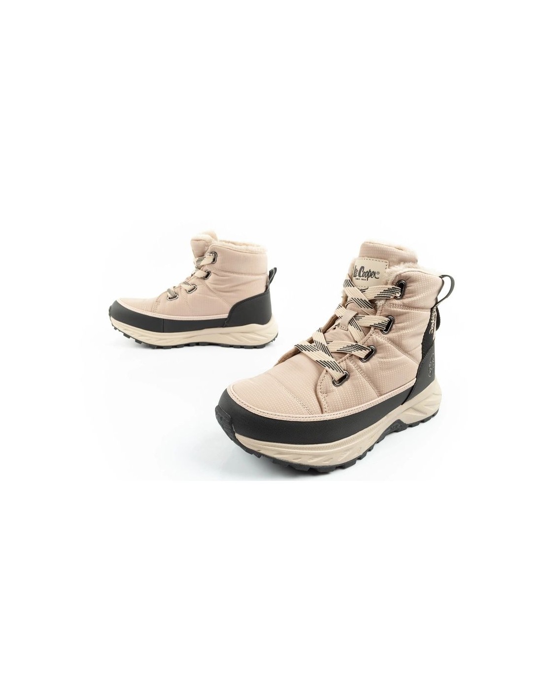 Lee Cooper women\’s winter hiking shoes, insulated, beige, black Insulated winter boots for women. The upper is made of the highest quality textile and synthetic material, which should be impregnated before use to provide the shoes with additional protection against moisture. Soft inner insulation effectively protects against the cold, and the raised upper stabilizes the ankle and increases comfort. The thick, fully cushioned outsole ensures comfort on every walk. The lacing system used in the shoes ensures a perfect fit to the foot. The perfect footwear for any fashionable style. Hiking boots from Lee Cooper. The universal design of Lee Cooper shoes is perfect for both casual and sporty styles. These are shoes that will work well in autumn and winter conditions, guaranteeing warmth, comfort and a fashionable look.