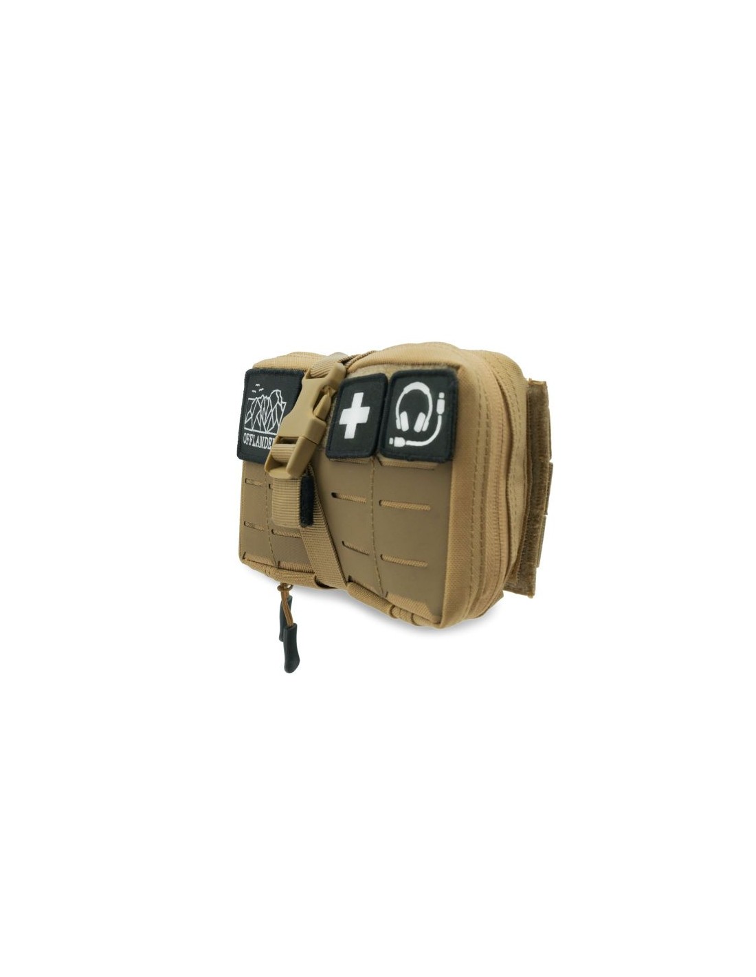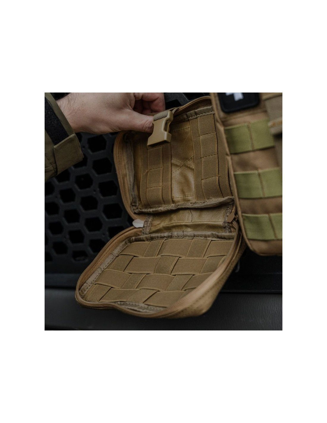 - Στο πίσω μέρος του σάκου υπάρχει ένα πάνελ στερέωσης που μπορεί να αποσπαστεί με Velcro, το οποίο περιέχει επίσης ταινίες PALS (Pouch Attachment Ladder System) με κουμπώματα που σας επιτρέπουν να προσαρτήσετε το κουτί πρώτων βοηθειών σε ζώνη, τακτικό γιλέκο ή σακίδιο.