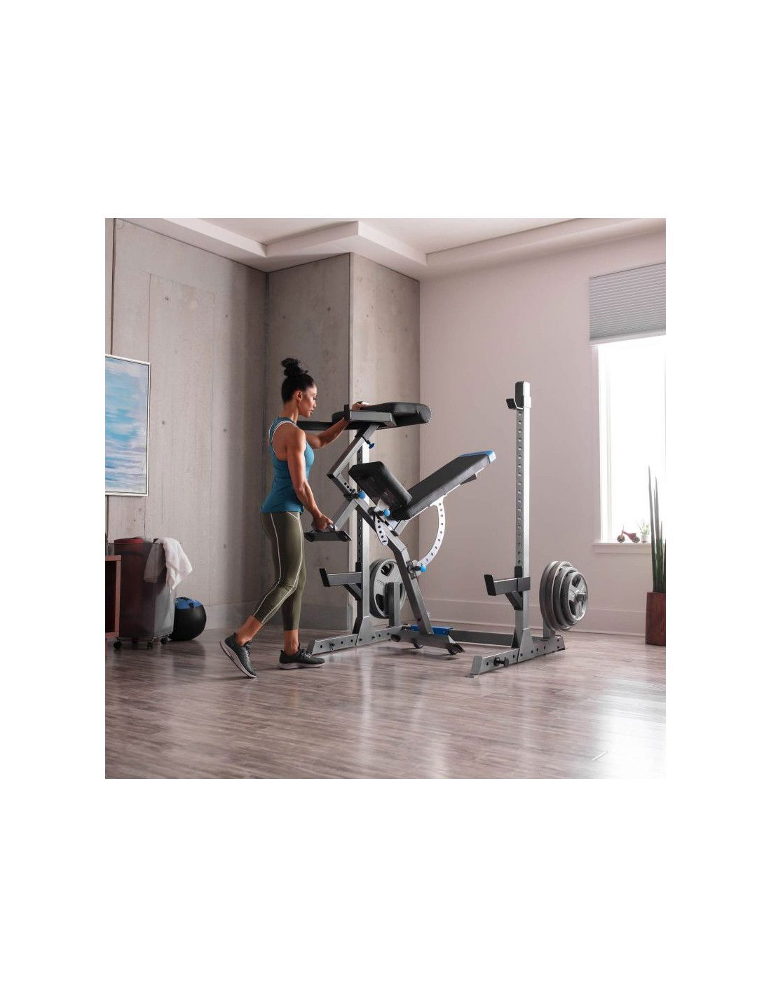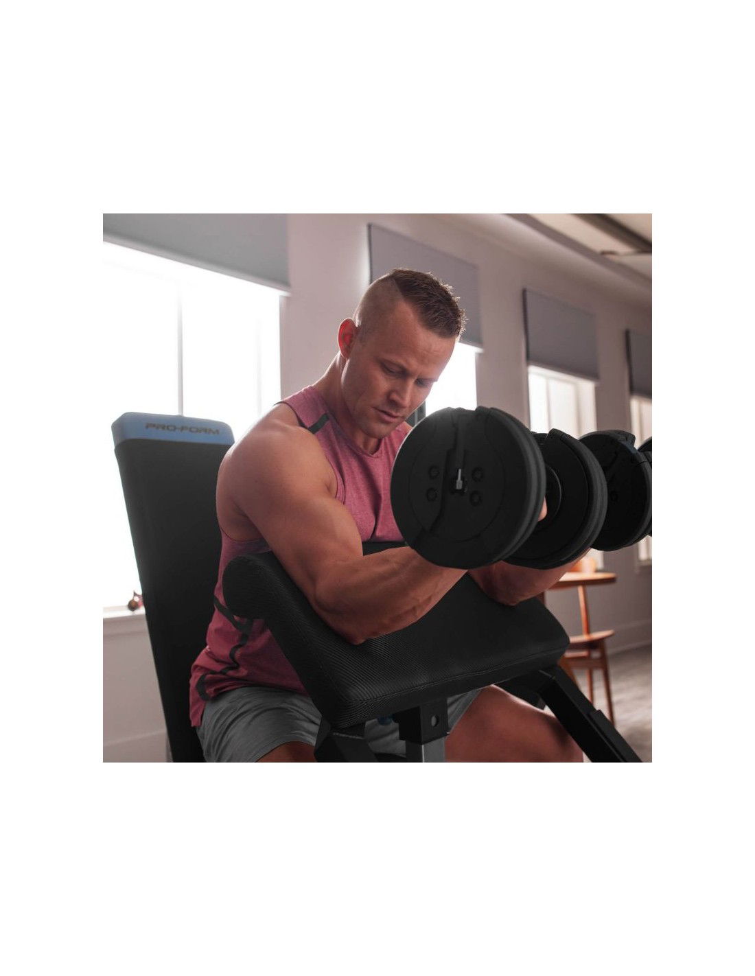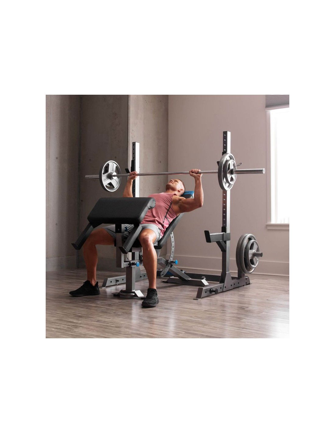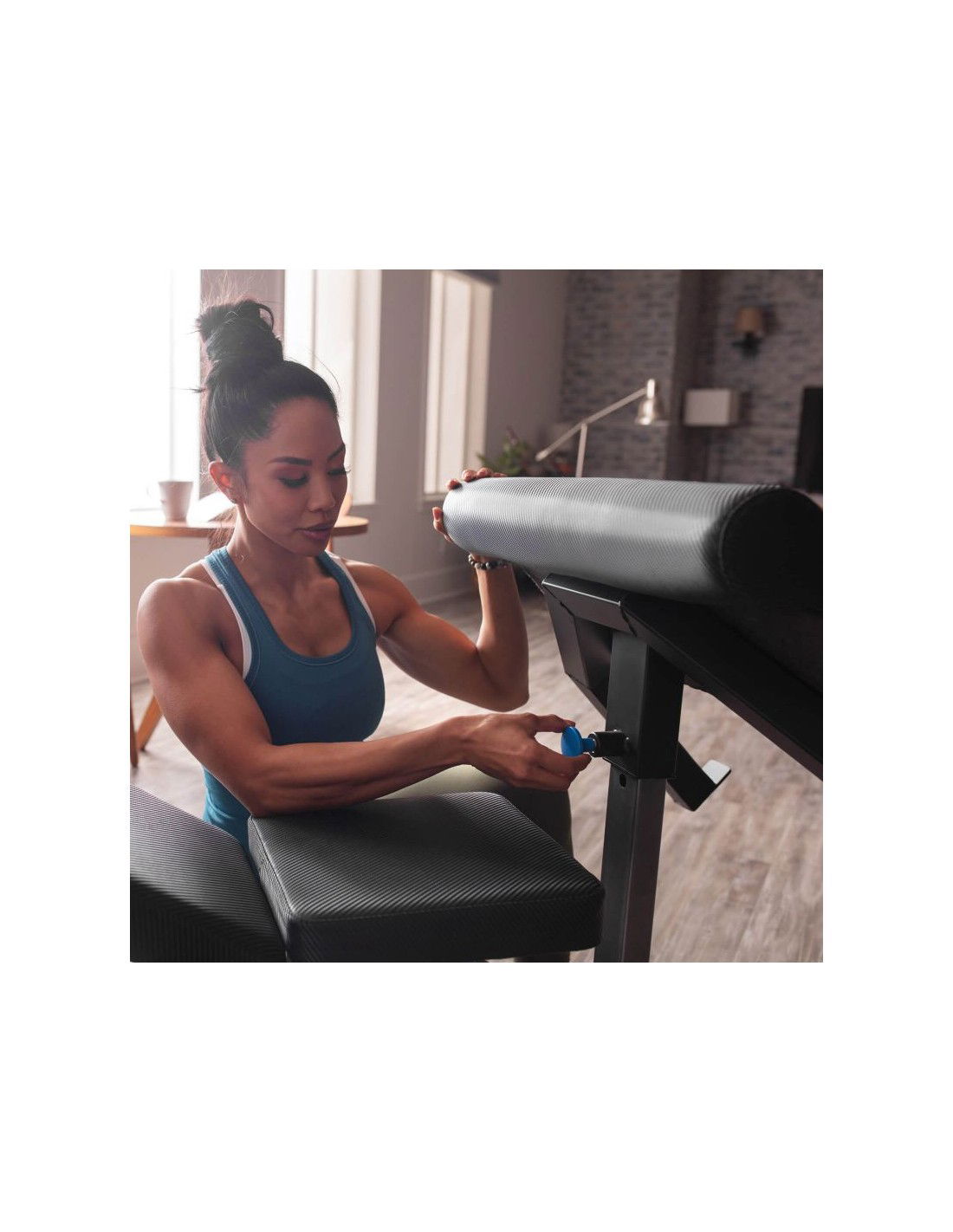 • Το σετ με τον πάγκο περιλαμβάνει επίσης ένα ρυθμιζόμενο preacher με υποδοχή για μπάρα, την οποία μπορείτε να αφαιρέσετε αν χρειαστεί.