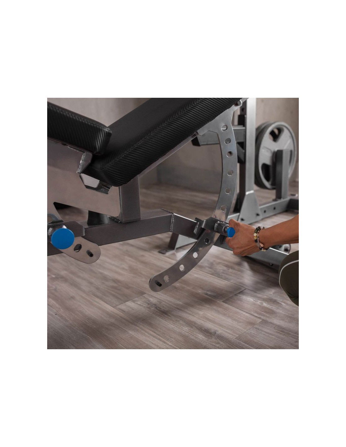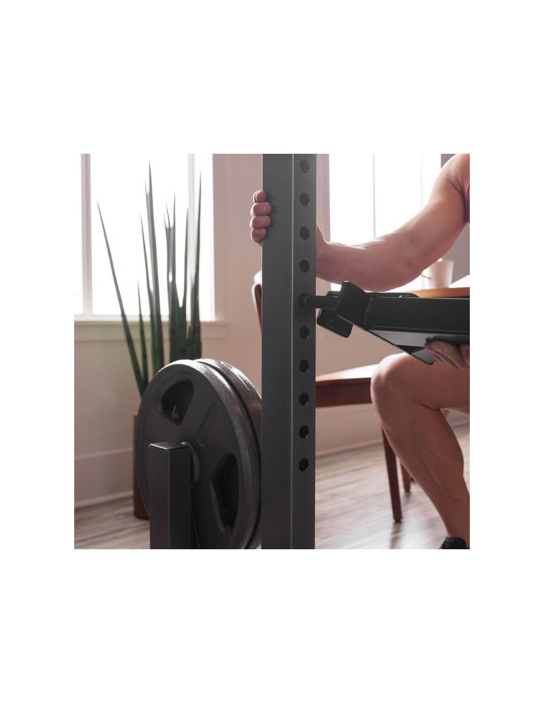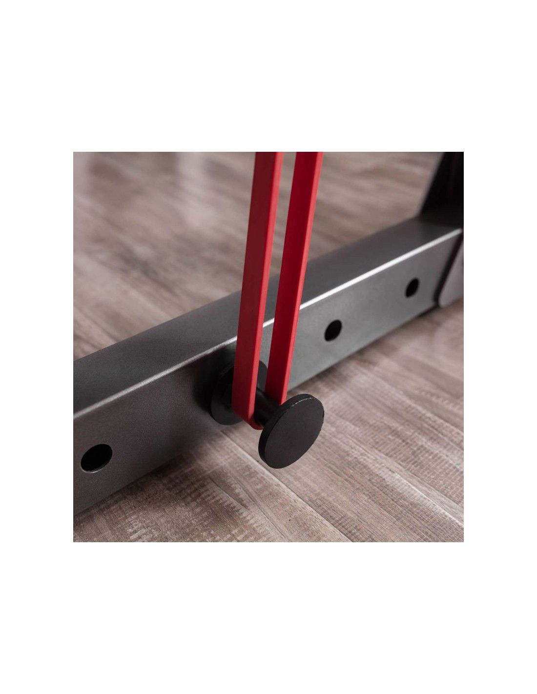 • Μπορείτε να ρυθμίσετε τις χειρολαβές των μπάρας σε ένα βολικό για εσάς ύψος, ανάλογα με το ύψος σας και τις ασκήσεις που θέλετε να εκτελέσετε. Αυτό καθίσταται εφικτό χάρη στους γάντζους ασφαλείας, τους οποίους μπορείτε να ρυθμίζετε ελεύθερα. Η ρύθμιση αυτή σας επιτρέπει να ρυθμίζετε το ύψος της μπάρας και την απόστασή της από τον πάγκο, καθιστώντας την ακόμα πιο καθολική. Επιπλέον, η βάση είναι εξοπλισμένη με δύο υποδοχείς φορτίου που θα σας επιτρέψουν να διατηρήσετε την τάξη στο γυμναστήριο του σπιτιού σας. Στη βάση υπάρχουν επίσης υποδοχές για τα λάστιχα προπόνησης.