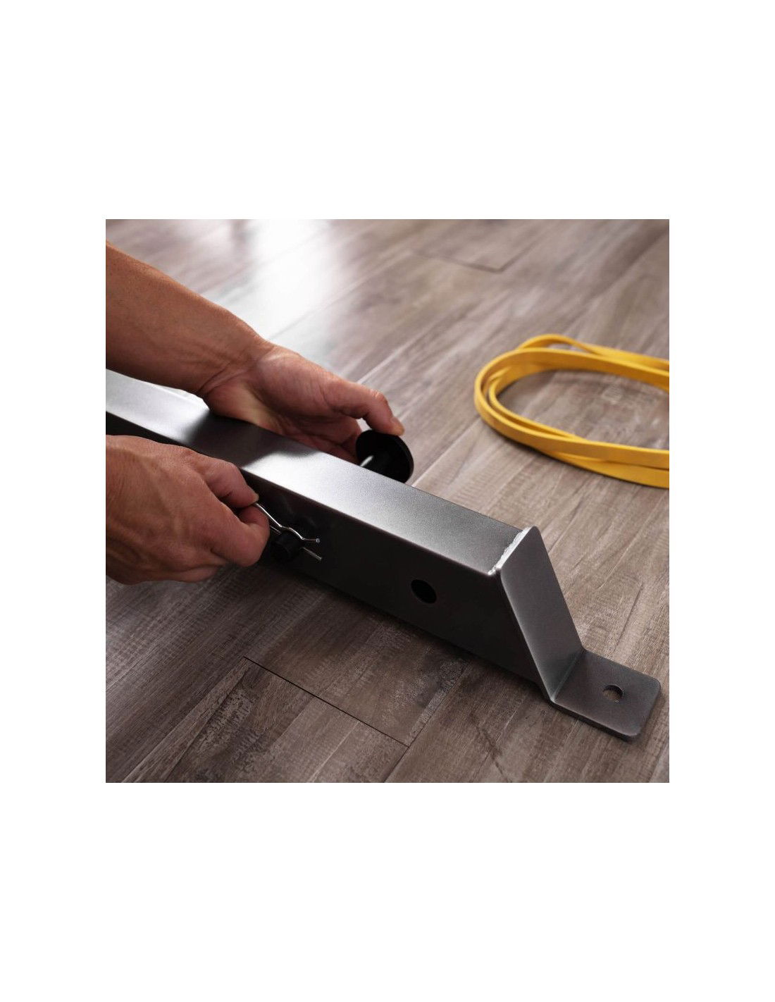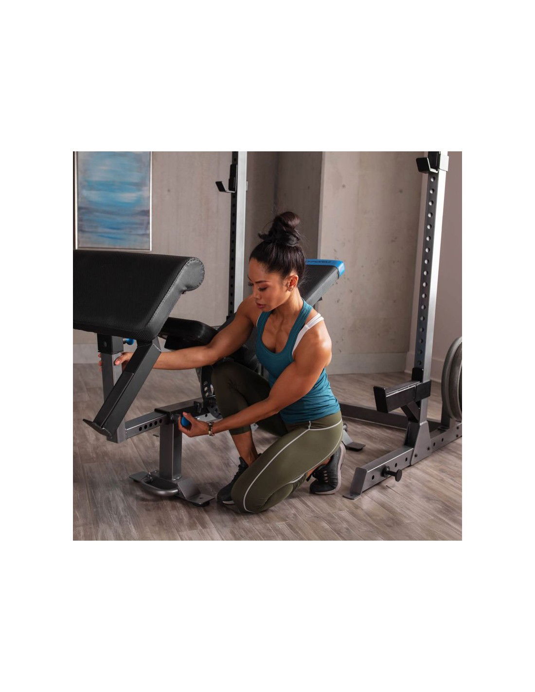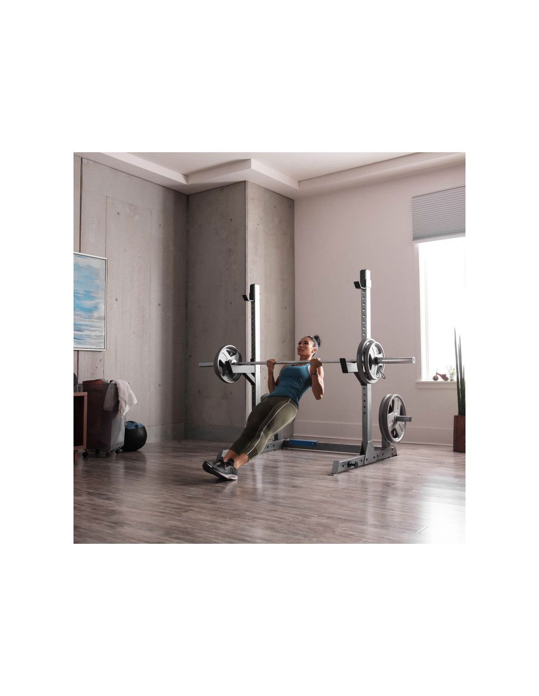 • Μπορείτε να ρυθμίσετε τις χειρολαβές των μπάρας σε ένα βολικό για εσάς ύψος, ανάλογα με το ύψος σας και τις ασκήσεις που θέλετε να εκτελέσετε. Αυτό καθίσταται εφικτό χάρη στους γάντζους ασφαλείας, τους οποίους μπορείτε να ρυθμίζετε ελεύθερα. Η ρύθμιση αυτή σας επιτρέπει να ρυθμίζετε το ύψος της μπάρας και την απόστασή της από τον πάγκο, καθιστώντας την ακόμα πιο καθολική. Επιπλέον, η βάση είναι εξοπλισμένη με δύο υποδοχείς φορτίου που θα σας επιτρέψουν να διατηρήσετε την τάξη στο γυμναστήριο του σπιτιού σας. Στη βάση υπάρχουν επίσης υποδοχές για τα λάστιχα προπόνησης.