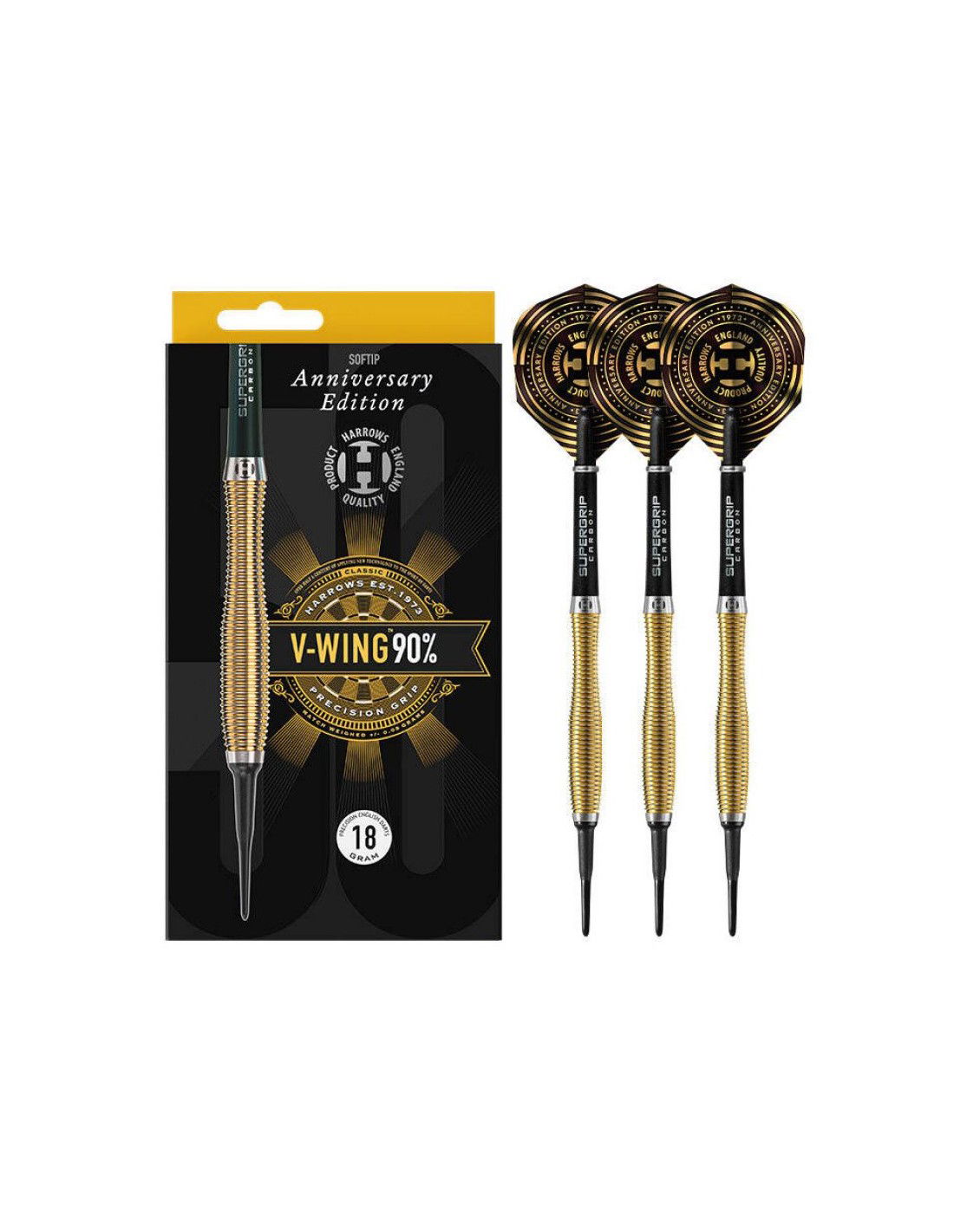 - Τα βελάκια είναι εφοδιασμένα με άξονες Midi Supergrip Carbon και νέες πτήση Harrows Anniversary 100 micron.