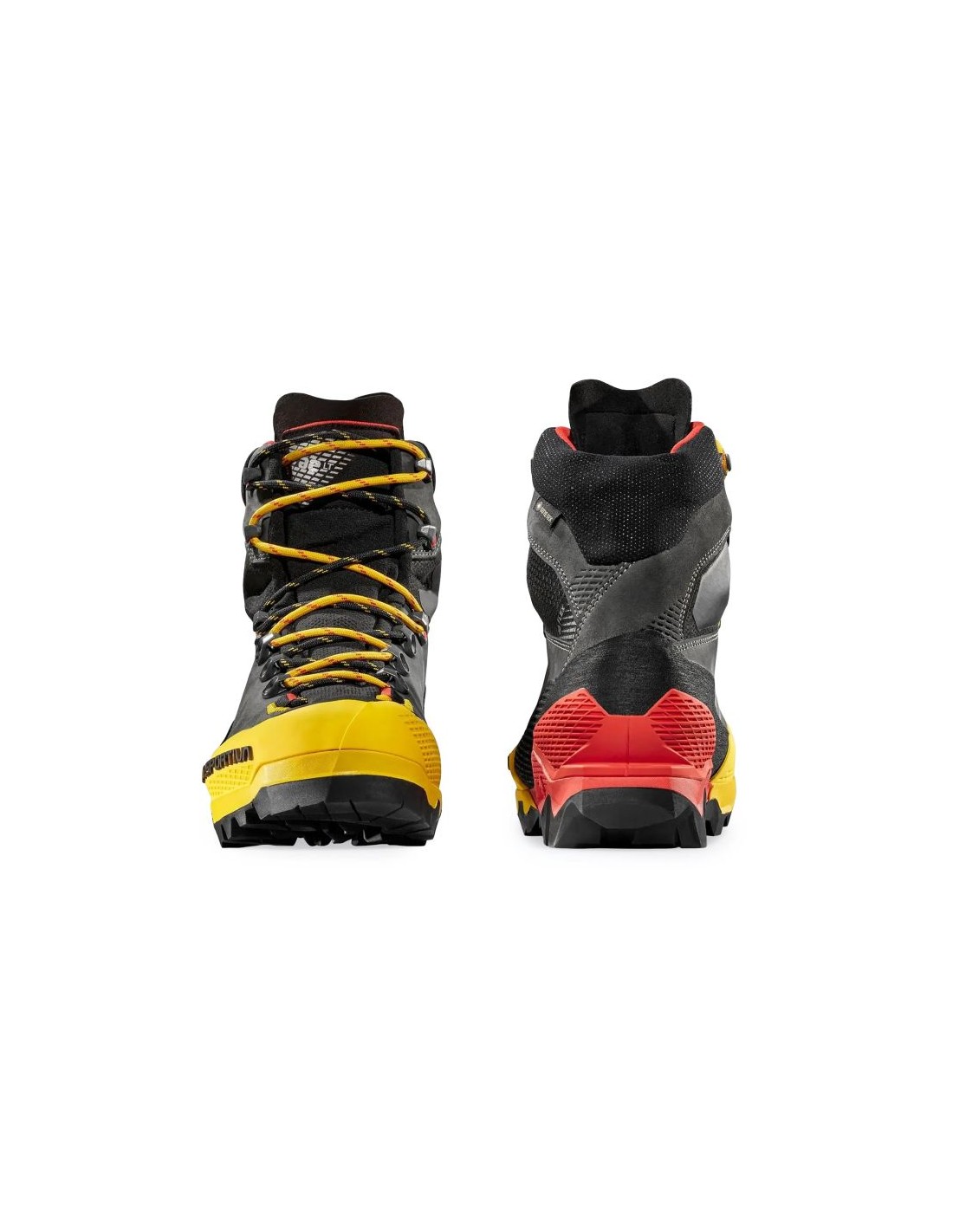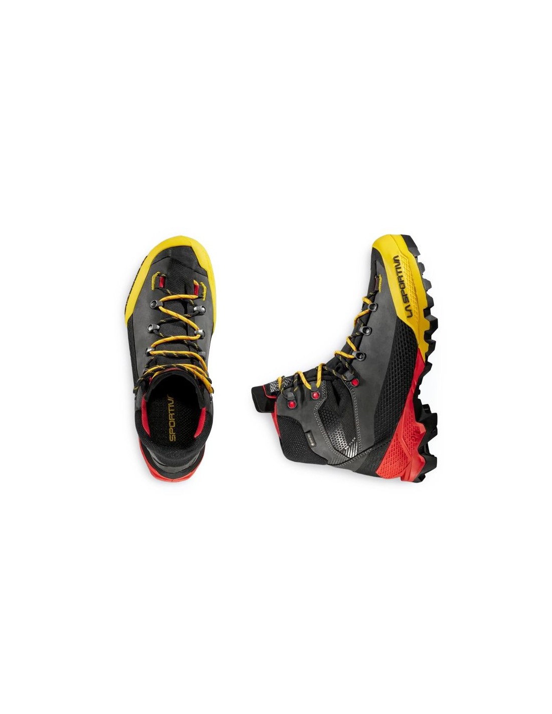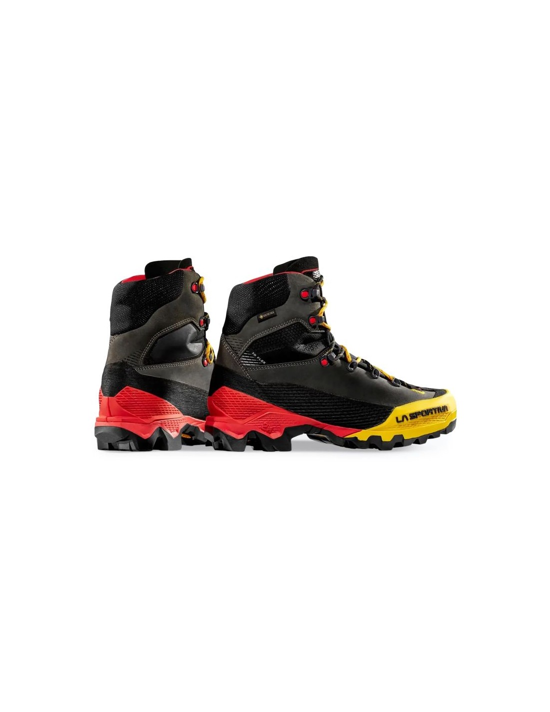 La Sportiva Aequilibrium LT GTX ZFMS096K00Y00 Black/Yellow The La Sportiva Aequilibrium LT GTX Black/Yellow is a high-performance trekking and mountaineering boot designed for multi-day backpacking trips and challenging mountain ascents. The upper is constructed from waterproof nubuck with abrasion-resistant fabric inserts, and TPU reinforcements at the toe and heel enhance protection. The boot features a GORE-TEX Performance Comfort membrane, providing both waterproofness and breathability, keeping your foot dry even in wet or variable conditions. The \”3D Flex System Evo\” construction provides improved ankle mobility while maintaining support and stability. The \”Double Heel™\” system, with its pronounced heel counter, improves braking during descents and makes for a smoother ride, reducing muscle fatigue. The Vibram SpringLug Tech outsole with Impact Brake System provides traction on rocks and hard surfaces. A reinforced nylon-carbon insole (carbon/nylon) and a soft PU foam midsole enhance comfort. Each half-pair weighs approximately 640g , striking a good balance between durability and weight for such a high-end model.
