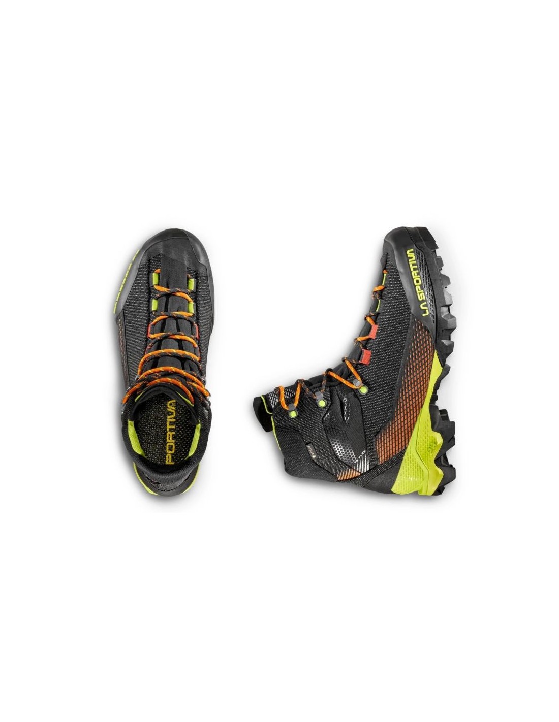 La Sportiva Aequilibrium ST GTX ZFMS098G00E29 Carbon/Lime punch The La Sportiva Aequilibrium ST GTX Carbon/Lime Punch is a technical trekking-alpine model designed for variable conditions—via ferrata, glaciers, and rocky approaches. The upper is made of waterproof 60/6 nylon with HoneyComb Guard reinforcements, featuring reinforced TPU toe and heel guards. A GORE-TEX Performance Comfort membrane protects against moisture while maintaining good breathability. The interior features a \”bellows\” tongue (bonded), a soft material covering the upper (snow guard) that protects against snow and stones. The \”3D Flex System Evo\” construction ensures ankle mobility while providing high protection. The Vibram SpringLug Tech outsole with Impact Brake System lugs provides traction on hard and slippery surfaces. Additionally, the boots are compatible with semi-automatic crampons, increasing their functionality in alpine conditions. Half a pair weighs approximately 630 g (approximately a standard size).